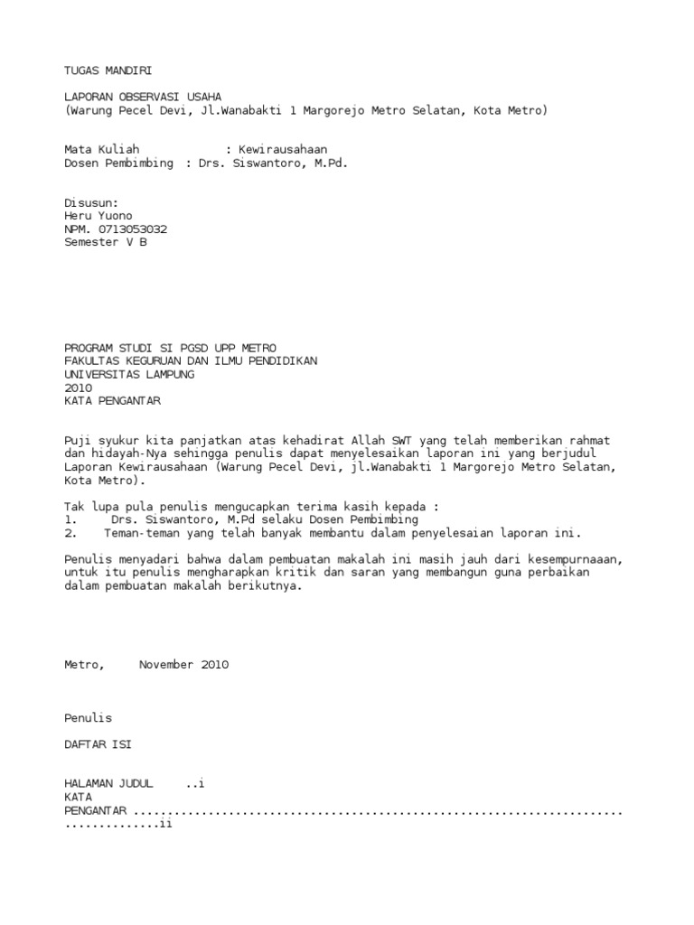Contoh kata pengantar laporan observasi. Kata pengantar pertama dan yang utama penulis memanjatkan puji dan sykur kepada yang maha kuasa. Kata pengantar laporan sangat penting bagi siswa atau mahasiswa untuk membuat kata pengantar untuk tugas laporan. Karena berkat rahmat dan karunia nyalah penulis dapat menyelesaikan laporan observasi ini sesuai waktu yang telah di tentukan. Baik menyusun karya ilmiah maupun karya non ilmiah. Contoh kata pengantar untuk laporan hasil observasi. Sayangnya pembuatan kata pengantar kadang kadang diremehkan dan dianggap sepele bahkan dalam penulisannya masih banyak yang dangkal.