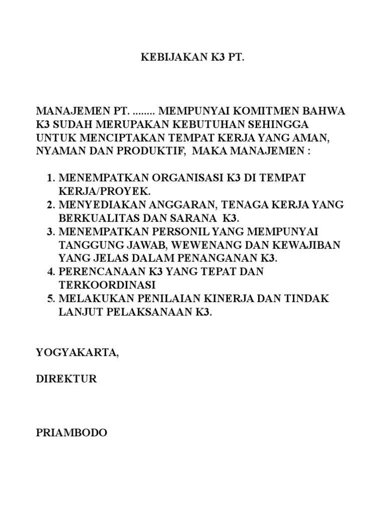 Contoh kebijakan k3 di perusahaan pdf. Berikut ini salah satu regulasi yang mutlak dimiliki oleh perusahaan yakni adanya ahli k3 di perusahaan tersebut. Smk3 adalah sistem manajemen yang terintergrasi untuk menjalankan dan mengembangkan kebijakan k3 yang telah ditetapkan perusahaan serta menanggulangi resiko bahaya yang mungkin terjadi di perusahaan. Menempelkannya pada dinding di perusahaan terutama pada tempat tempat strategis agar karyawan dapat membaca isi dari kebijakan k3 tersebut. 50 perusahaan sudah membentuk. Tanggung jawab untuk kesesuaian di dalam pengelolaan perusahaan terhadap peraturan perundang undangan yang berlaku dan prinsip prinsip perusahaan yang sehat. Dk3n depnakertrans dpn apindo spsb.