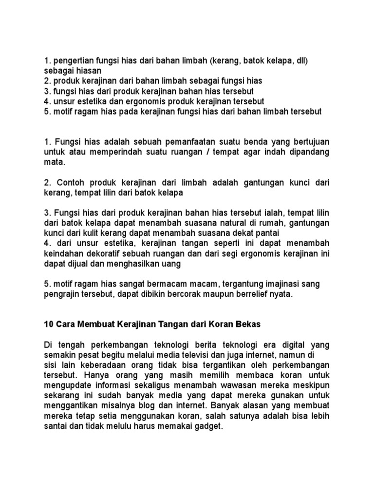 Tikar kursi kayu meja lampu hias dan lain lain. Keunikan bahan kerajinan fungsi hias sumber daya alam indonesia yang dapat dimanfaatkan sebagai bahan dasar kerajinan tersedia sangat berlimpah. Selamat datang di pakdosencoid web digital berbagi ilmu pengetahuan. Berbeda dengan sebelumnya kerajinan dengan fungsi hias adalah barang barang kerajinan yang yang lebih menonjolkan sisi estetika dan keindahan dibandingkan fungsinya. Contoh dari kerajinan fungsi hias bahan limbah adalah lukisan dari sisik ikan atau bunga dari kulit jagung. Contoh kerajinan yang memiliki fungsi pakai misalnya.