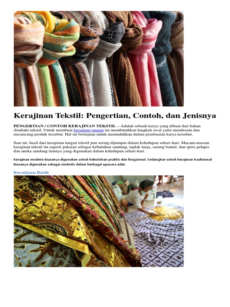 Pada artikel kali ini penulis akan menjelaskan mengenai kerajinan tekstil lebih dalam lagi mengenai pengertian kerajinan tekstil macam macam kerajinan tekstil contoh kerajinan tekstil. Alat yang digunakan biasanya masih sangat sederhana dan tidak bisa memperoduksi barang dalam jumlah banyak. Tekstil merupakan material fleksible yang dibuat dari tenunan benang. Contoh kerajinan tekstil sederhana adalah kain tenun. Sebagai pemenuhan sandang bagi tubuh. Contoh kerajinan tekstil modern ini meliputi.