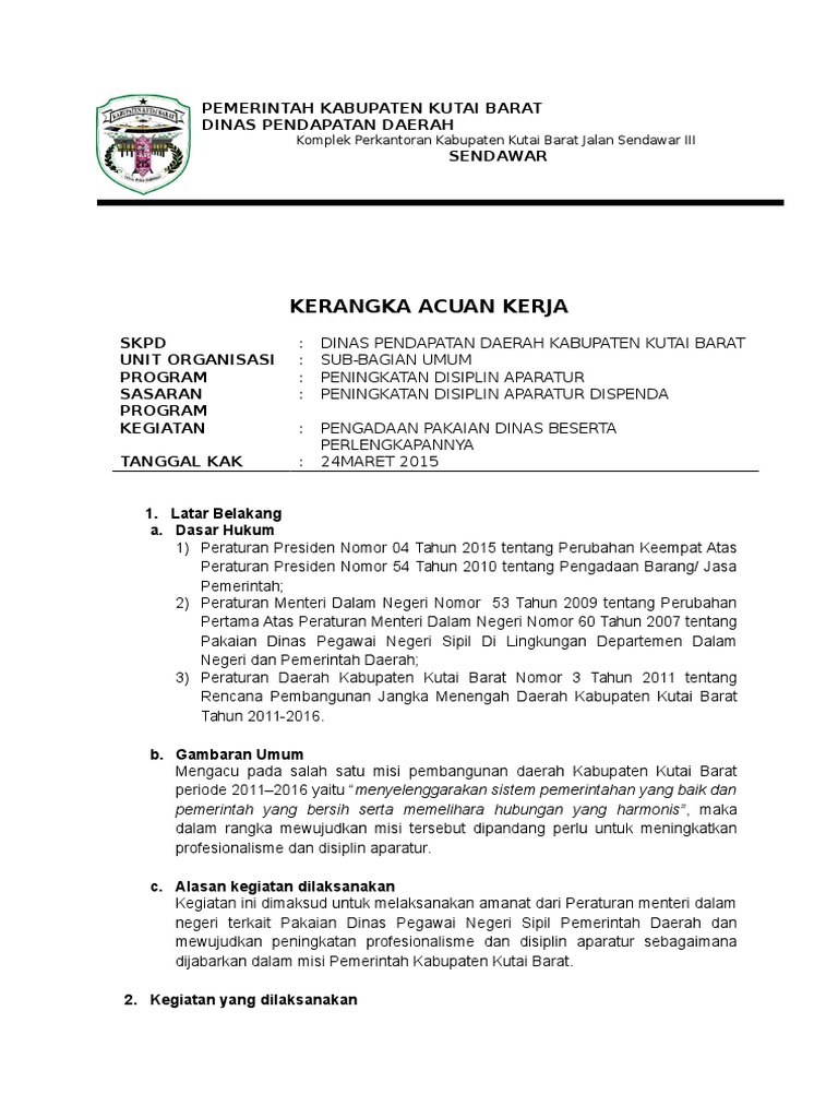 Contoh kerangka acuan kerja. Program pendidikan dan pelatihan aparatur kementerian keuangan. Kementerian keuangan kerangka acuan kerjaterm of reference keluaran gedung olahraga ta 2013. Perundang undangan 0093 diperlukan sebagai acuan dan pedoman bagi kementeriaan negaralembaga dalam proses perencanaan penganggaran dalam rka kl. Term of reference atau disingkat tor dalam pengertian bahasa indonesia disebut dengan kerangka acuan kerja atau disingkat kak. Kerangka acuan ke giatan kementerian negaralembaga. Kerja dalam melaksanakan kegiatannya dalam suatu tahun anggaran.