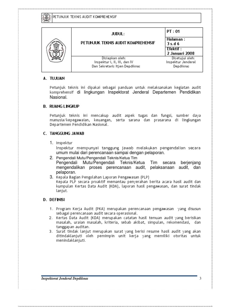 Dokumen ini dibuat berdasarkan kertas kerja audit. M elanjutkan pembahasan pada artikel sebelumnya mengenai profil inspektorat jenderal kementerian keuangan ri kali ini saya memberikan contoh sederhana kertas kerja audit atas bidang inspektorat i pada itjen kemenkeu ri. Tujuan keputusan inspektur daerah istimewa yogyakarta ini adalah sebagai petunjukacuan bagi aparat pengawas internal pemerintah pada inspektorat. Sas 41 working papers au 33903 menguraikan kertas kerja working papers sebagai catatan yang disimpan oleh auditor tentang prosedur audit yang diterapkan pengujian yang dilaksanakan informasi yang diperoleh dan kesimpulan tentang masalah yang dicapai dalam audit. Pedoman audit kinerja dilingkungan inspektorat kabupaten natuna 53 1999 1. Namun kka ini hanya memuat tiga tahap awal pada survei pendahuluan yakni pemahaman atas entitas yang diaudit identifikasi area kunci serta penetapan tujuan dan lingkup audit.