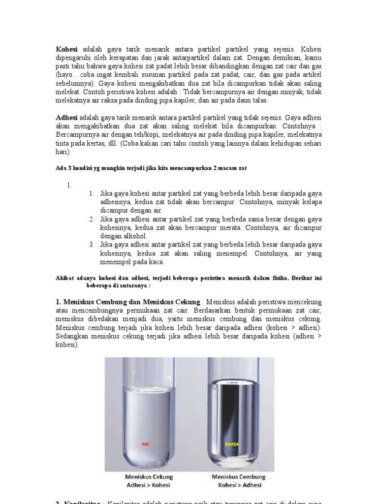 Pengertian gaya kohesi dan adhesi gaya kohesi. Kohesi dipengaruhi oleh kerapatan dan jarak antarpartikel dalam zat baca. Akibat dari adanya adhesi dan kohesi. Gejala ini disebabkan adanya gaya adhesi atau kohesi antara zat cair dengan dinding celah itu. Apabila gaya adhesi ini lebih besar daripada gaya kohesi maka yang terjadi kedua zat akan saling menempel. Ada 3 hal peristiwa unik yang terjadi akibat dari adanya kedua jenis gaya tarik menarik partikel tersebut.