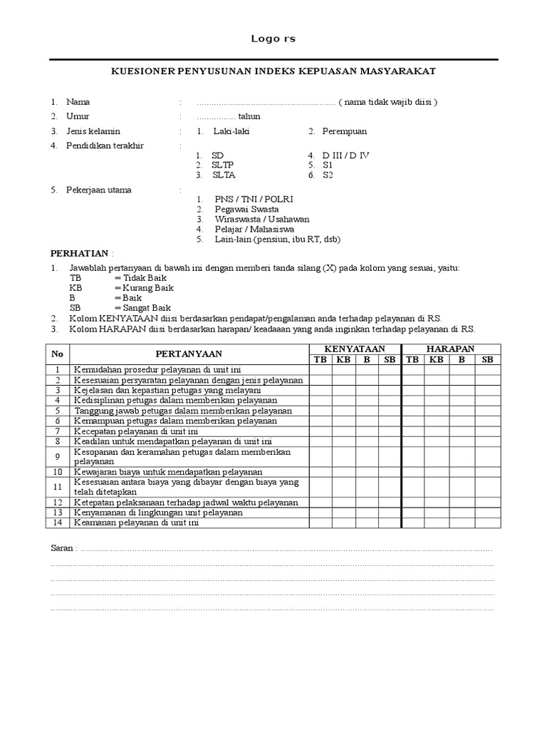 Contoh kuesioner kepuasan pelayanan. Nah itulah contoh kuesioner yang baik dan benar. Contoh standar operasional prosedur ini dengan form survey kepuasan pelanggan serta contoh format penilaian kepuasan pelanggan semoga bisa bermanfaat dan membantu anda. Survei kepuasan konsumen. Ss skor 5 sangat sering. Kuesioner ini dibagi menjadi empat bagian yaitu identitas responden kuesioner kepuasan pelanggan kuesioner proses bisnis internal dan kuesioner pertumbuhan dan pembelajaran. Isilah kuesioner ini sesuai dengan kondisi yang terjadi pada rsud x.