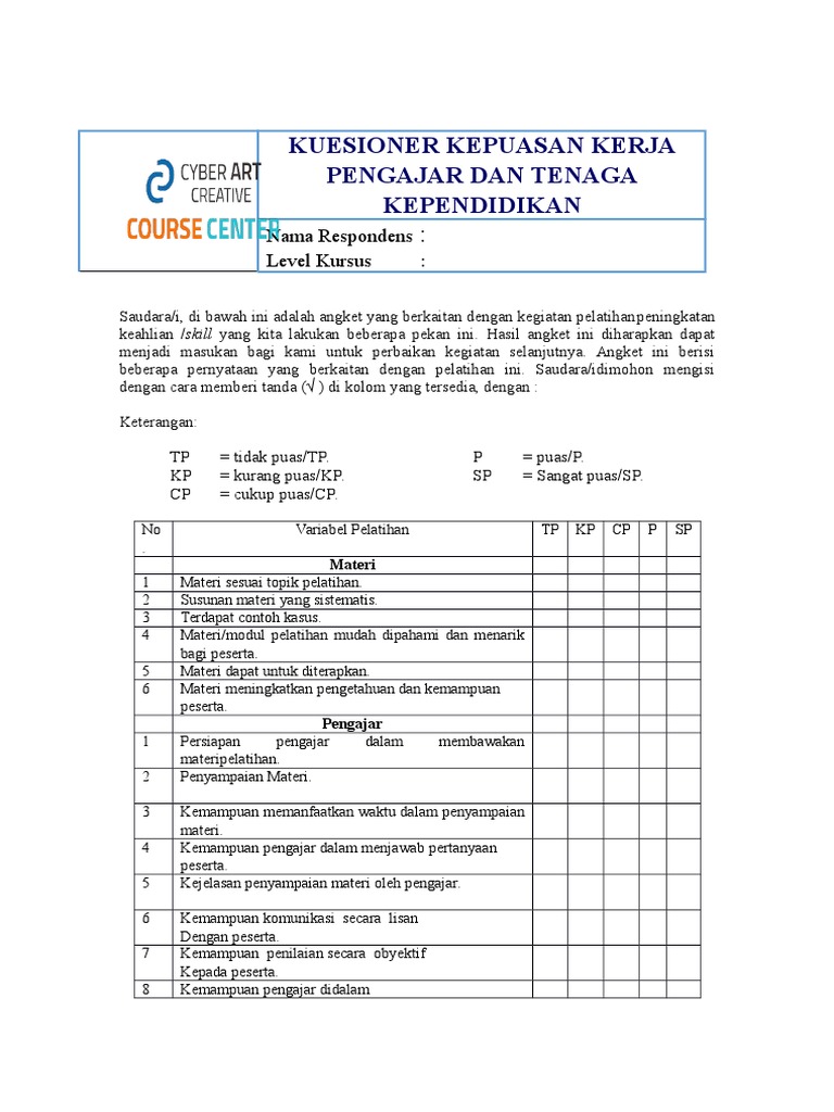Analisis pengaruh kualitas pelayanan terhadap tingkat. Dalam rangka meningkatkan kualitas pelatihan pegawai yang telah mengikuti pelatihan dimohon untuk mengisi kuesioner evaluasi pasca pelatihan pada link. Dalam rangka mengetahui dampak pelatihan terhadap peningkatan kinerja dan sikap pegawai di unit kerja masing masing. Selanjutnya berikut ini saya sajikan contoh kuesioner kepuasan pelanggan yang juga bisa kamu download untuk keperluan survey usahamu. Lancar bimbingan yang diberikan instruktur dalam pelatihan mudah dimengerti. Untuk rekan kerja pegawai peserta pelatihan.