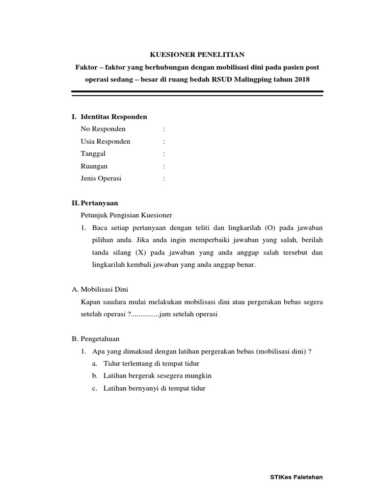 Angket atau kuesioner merupakan instrumen dari penelitian kuantitatif yang disimpulkan dalam bentuk kualitatif. Menurut beberapa ahli dalam bidang penelitian kuantitatif terdapat metode dan beberapa jenis penelitian yang digunakan diantaranya sebagai berikut. Pendapat whitne 1960 metode deskriptif adalah suatu pencarian fakta yang menggunakan interprestasi yang tepat. Kuesioner penelitian hubungan antara kepemimpinan dan disiplin kerja dengan kinerja petugas surveilans diare di dinas kesehatan kota salatiga mohon kesediaan bapakibusdr untuk mengisi kuesioner ini. Anda sedang mencari contoh kuesioner penelitian. Jika iya maka anda datang pada tempat yang tepat.