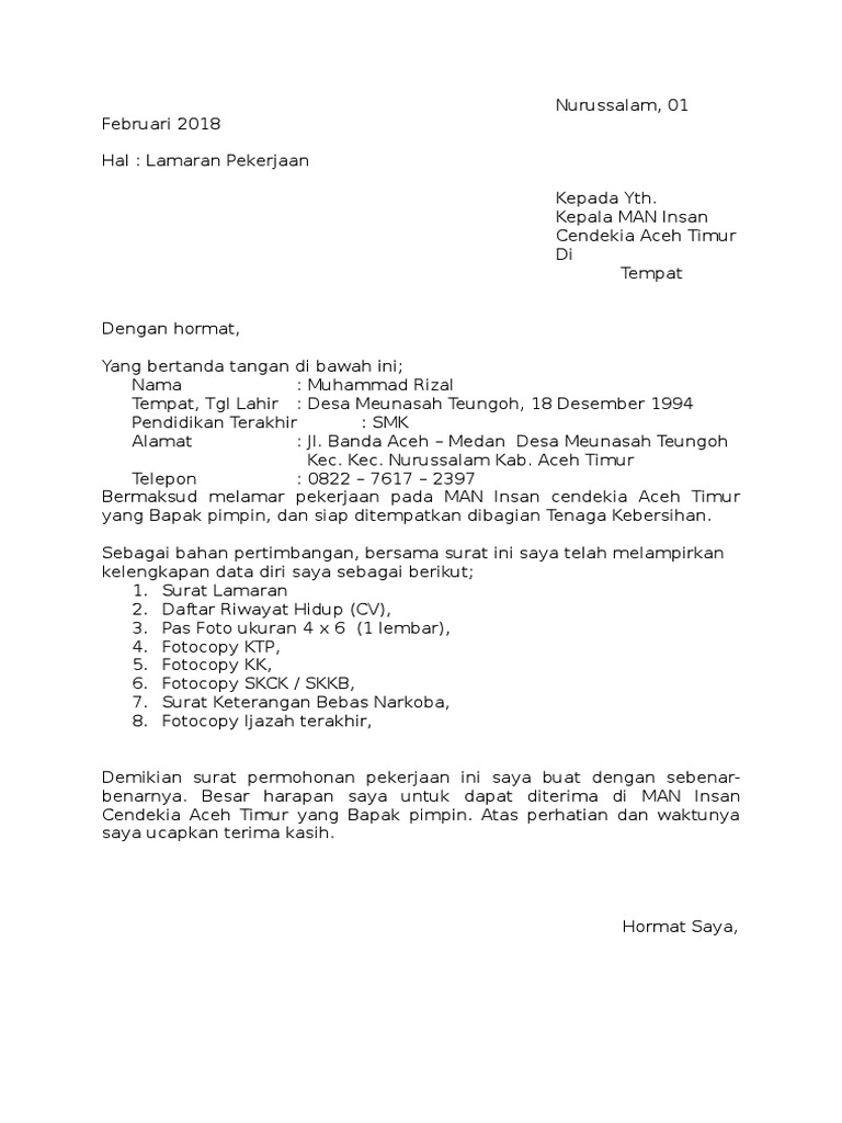 Contoh surat lamaran kerja membuat surat lamaran kerja tidak boleh asal dalam membuatnya membutuhkan acuan sebagai referensi contoh surat lamaran kerja ini adalah salah satu bahan yang bisa dijadikan acuan dalam membuat surat lamaran pekerjaan. Di tahun 2018 ini banyak orang di indonesia sedang mencari pekerjaan. Contoh surat lamaran kerja tutorial dan contoh surat lamaran kerja ini saya rasa sangat penting untuk diperhatikan mengingat lapangan pekerjaan semakin memiliki tingkat daya saing yang sangat tinggi oleh karena itu jika anda benar benar berusaha mencari lapangan pekerjaan mulailah dengan hal paling penting pertama yaitu bagaimana cara membuat surat lamaran pekerjaan yang baik dan benar. Contoh surat lamaran kerja 2019 terbaru bagi seseorang yang ingin bekerja pada suatu perusahaan pasti akan mendaftarkan diri dengan membuat persyaratan tertentu agar kemungkinan besar diterima pada perusahaan tersebut yang salah satunya adalah surat lamaran kerja. Kepala sekolah sma arrohmah putri malang jl. Raya jambu no1 sumbersekar dau malang jawa timur.