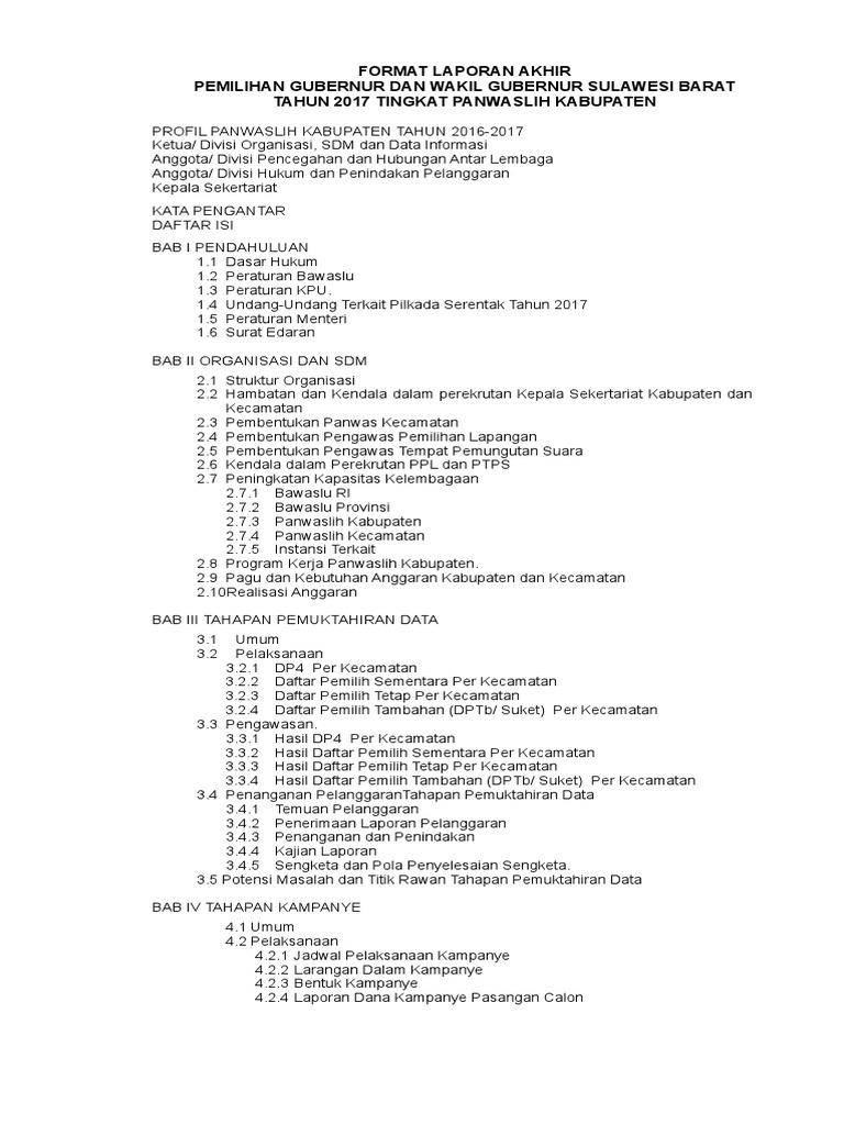 Contoh laporan akhir panwaslu kabupaten. Dari hasil perhitungan akhir yang telah ditetapkan oleh kpu provinsi jawa barat pada hari minggu tanggal 3 maret 2013 telah ditetapkan pasangan calon gubernur dan wakil gubernur nomor 4 empat atau h. Yaitu mokhamad kodir se msi ak sebagai ketua merangkap anggota dan dua anggota lainnya drs nur muktiadi dan tasikhin spd. Pilkada di 10 kabupatenkota peneliti utama program indonesia democ racy index. Pada tahap perekrutan panwaslu desa ini dilaksanakan pada tanggal 16 februari sampai 20 maret tahun 2020. Laporan kinerja 2017 menegakkan keadilan pemilu. Dalam menjalankan tugasnya panwaslu kecamatan pamarayan kabupaten serang dibantu oleh sekretariat sebagai mana diatur dalam pasal 107 undang undang nomor 15 tahun 2011.