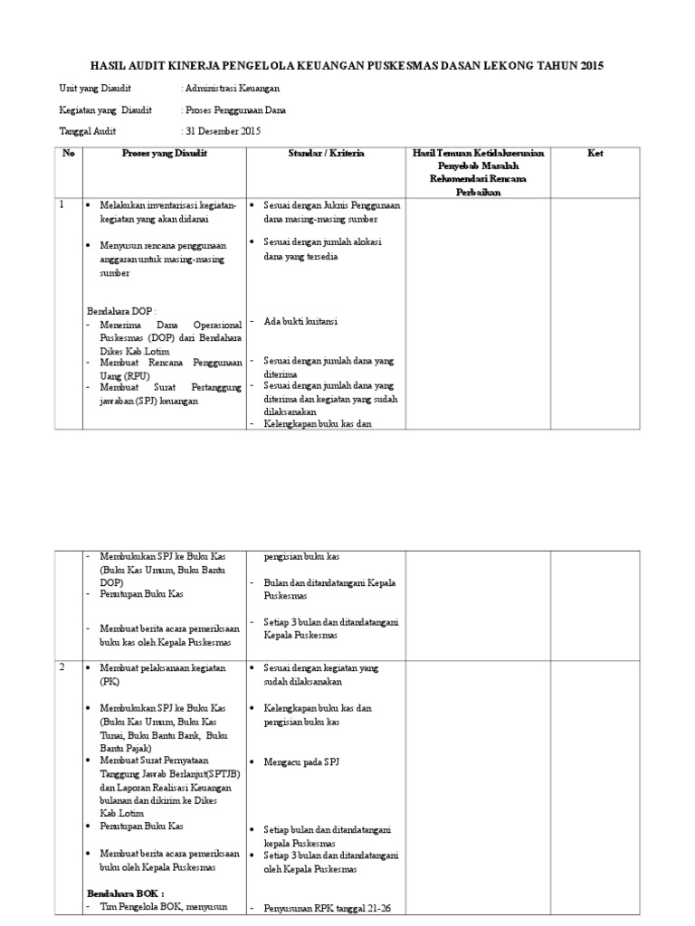 Contoh laporan audit kinerja. Contoh laporan hasil audit kinerja yang bisa bapakibu gunakan dan diunduh secara gratis dengan menekan tombol download biru dibawah ini. Sentosa mengusulkan untuk dapat menjadi rumah sakit pemerintah pengguna ppk blu dan pada tahun 2009 berdasarkan kebijakan pemerintah propinsi provinsi sejahtera rsuddr. Review atas hasil hasil program akan membant auditor untuk mengetahui apakah entitas telah melakukan sesuatu yang benar. Telaah hasil hasil program telaah ekonomi dan efesiensi dan telaah kepatuhan disusun untuk memban t u auditor dalam mencapai tujuan audit kinerja. Menyusun laporan hasil audit investigatif yang profesional. Download rpp silabus prota prosem kkm skkd ktsp 2006 sd kelas 5.