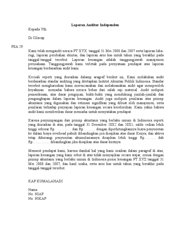 4 langkah mudah untuk melakukan audit perusahaan. Contoh laporan audit independen wajar tanpa pengecualian mengaudit adalah sebuah pekerjaan yang bisa dibilang merumitkan apalagi jika menyoal tentang audit sebuah perusahaan besar. Pengungkapan yang tidak cukup. Pendapat wajar tanpa pengecualian dengan bahasa penjelasan yang ditambahkan dalam laporan audit bentuk baku unqualified opinion with explanatory language pendapat ini diberikan jika terdapat keadaan tertentu yang mengharuskan seorang auditor menambahkan penjelasan bahasa penjelasan lain dalam laporan audit meskipun tidak mempengaruhi pendapat wajar tanpa pengecualian yang dinyatakan oleh. Laporan audit dengan pendapat wajar dengan pengecualian karena adanya. Menurut spap94 sa seksi 504 junto psa no.