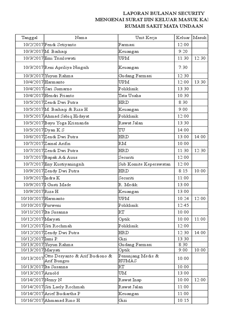 Contoh laporan bulanan satpam. Berikut ini adalah format excel file administrasi guru kelas versi digital terbaru 2016 yang merupakan kumpulan file dari berbagi sumber administrasi kelasaplikasi gurudownloadinfo gurujadwal pelajarankalender pendidikankumpulan rumus excelops sekolah tentang contoh format laporan bulanan satpam. Laporan bulanan satpam secara sederhana terdiri atas judul laporan tanggal laporan jenis kegiatan waktu pelaksanaan kegiatan dan jumlah personel yang bertugasselain laporan bulanan terdapat juga laporan harian dan laporan mingguan yang dikoordinir oleh seorang komando. Berikut ini beberapa cara dalam menulis laporan kejadian saat bertugas sebagai satpam. Contoh laporan singkat kegiatan jika kita bekerja pada sebuah institusi atau berorganisasi di sekolah setiap kegiatan yang diselenggarakan baik itu kegiatan pelatihan bakti sosial pramuka lomba 17 agustus dan acara acara lainnya pasti selalu dimintai pertanggungjawabannya entah itu berupa laporan tertulis ataupun dokumentasi berupa foto. Anda seorang satpam yang membutuhkan contoh form form satpam. Contoh laporan kegiatan satpam melayani contoh laporan kegiatan satpam gokil contoh laporan kegiatan satpam kampus contoh laporan kegiatan pramuka contoh laporan kegiatan prakerin contoh laporan kegiatan ekstrakurikuler contoh laporan kegiatan bakti sosial contoh laporan keuangan contoh laporan prakerin contoh laporan observasi.