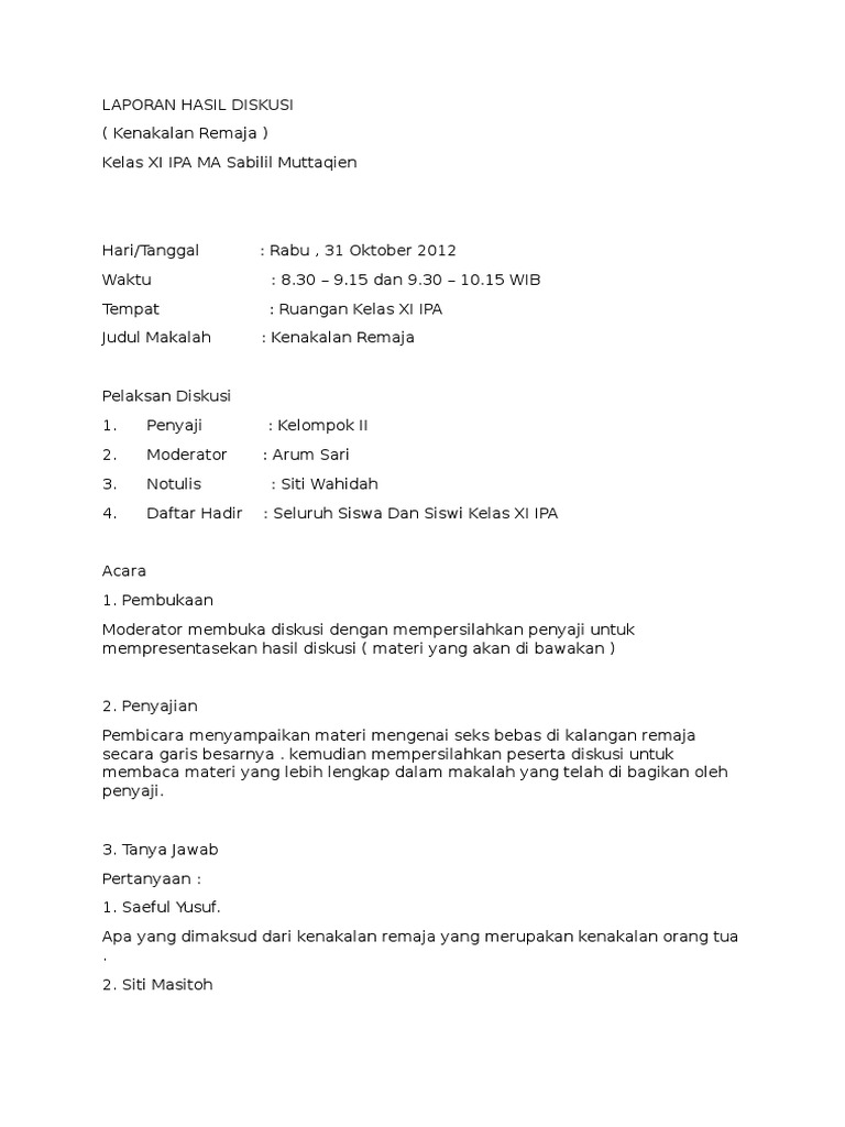 Contoh laporan hasil diskusi. Laporan hasil diskusi 1. Laporan mempunyai peranan yang penting pada suatu organisasi karena dalam suatu. Jarang yang kemudian mendokumentasikan suasana diskusi dan outputnya pada sebuah. Pembicara adalah orang yang menyampaikan dan membahas topik permasalahan yang didiskusikan. Contoh laporan hasil diskusi bila kita berada pada sebuah lingkungan organisasi tentu diskusi menjadi hal yang sangat lumrah untuk dilakukan namun sayang memang hari ini tidak banyak orang yang perhatian terhadap laporannya. Dengan adanya contoh ini saya berharap kalian dapat mendapatkan contoh dan mengembangkannya sesuai dengan tema yang akan kalian bahas.