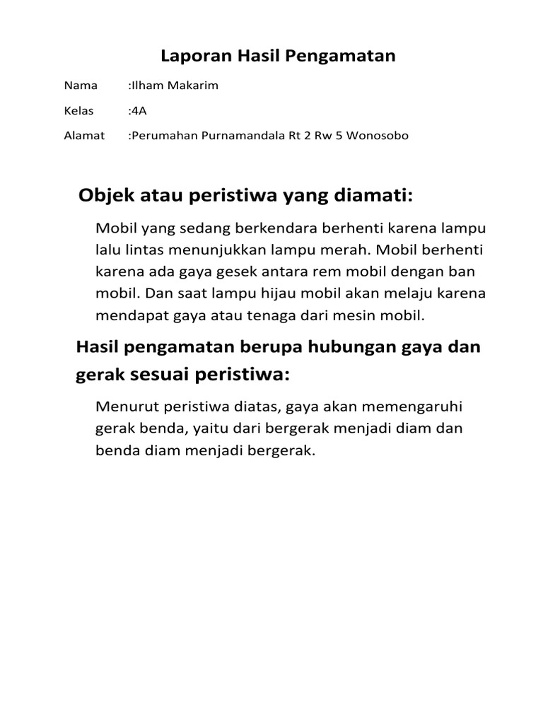 Contoh laporan hasil pengamatan. Gunung merapi meletus mengeluarkan awan panas b. Pernyataan umum pada teks laporan hasil observasi berisi tentang informasi atau definisi mengenai suatu hal yang dibahas atau hasil pengamatan yang telah dilakukan. Semoga dapat menjadi referensi kamu dalam menulis contoh laporan hasil pengamatan biologi yang baik dan benar. Contoh laporan hasil pengamatan untuk sd kelas 6contoh laporan ini adalah contoh laporan pengamatan yang telah dibuat agar nantinya bisa untuk dijadikan sebagai contoh yang nantinya kita bisa memperbaiki contoh ini kemudian dimodifikasi sesuai dengan keinginan dan objek pengamatan kita. Namun sebelum menuju contoh mari pelajari dulu struktur kaidah atau unsur ciri ciri dan tujuan dari teks laporan hasil observasi ini. Dalam contoh teks tersebut nantinya akan kamu temukan pemaparan subjek secara sistematik dan objektif sesuai dengan fakta dan klasifikasi hasil pengamatan.