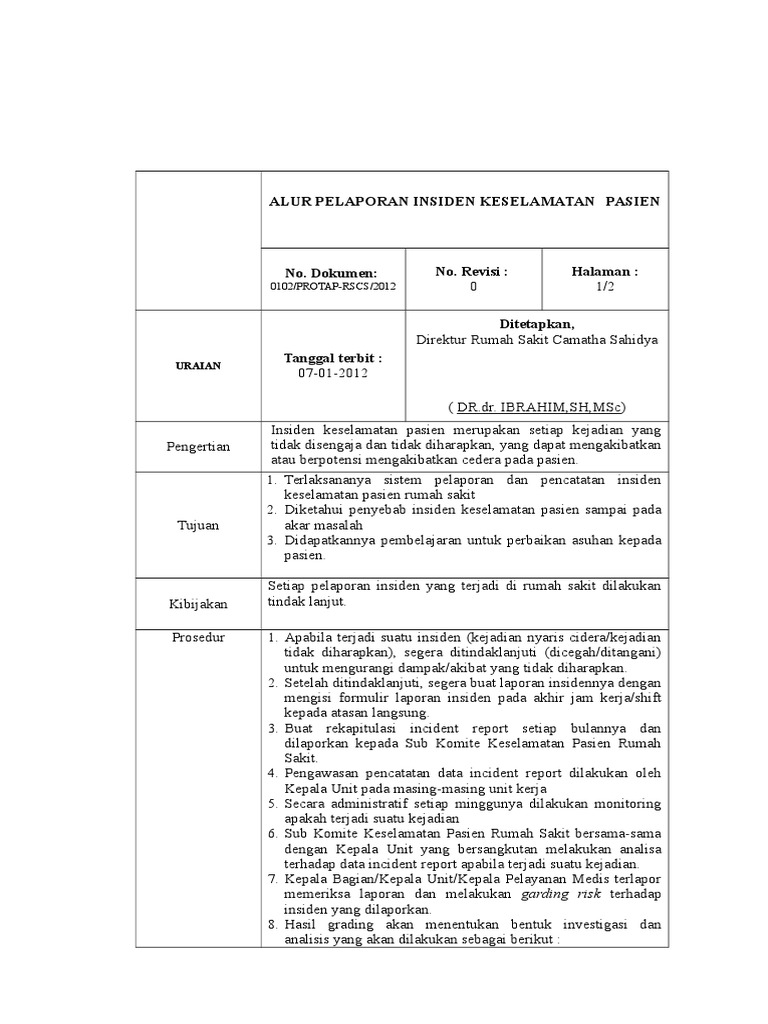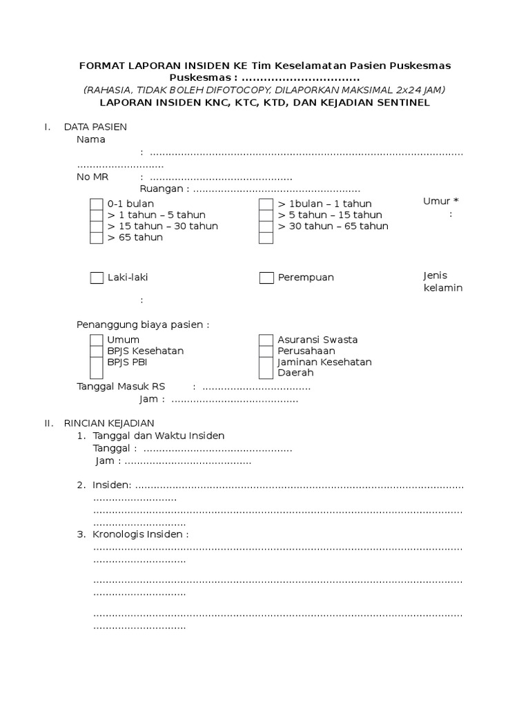 Contoh laporan insiden keselamatan pasien. Contoh insiden kpc kerusakan. Perawat memiliki kewajiban membuat laporan mengenai insiden keselamatan pasien. Laporan insiden keselamatan pasien kkp rs eksternal laporan insiden keselamatan pasien kkp rs eksternal adalah pelaporan secara anonim dan tertulis ke kkp rs setiap kondisi. Format laporan insiden keselamatan pasien akremas. Potensial cedera dan insiden knc ktc ktd kejadian sentinel keselamatan pasien yang terjadi pada pasien dan telah dilakukan analisa penyebab rekomendasi dan. Contoh laporan insiden keselamatan pasien di rumah sakitdocx.