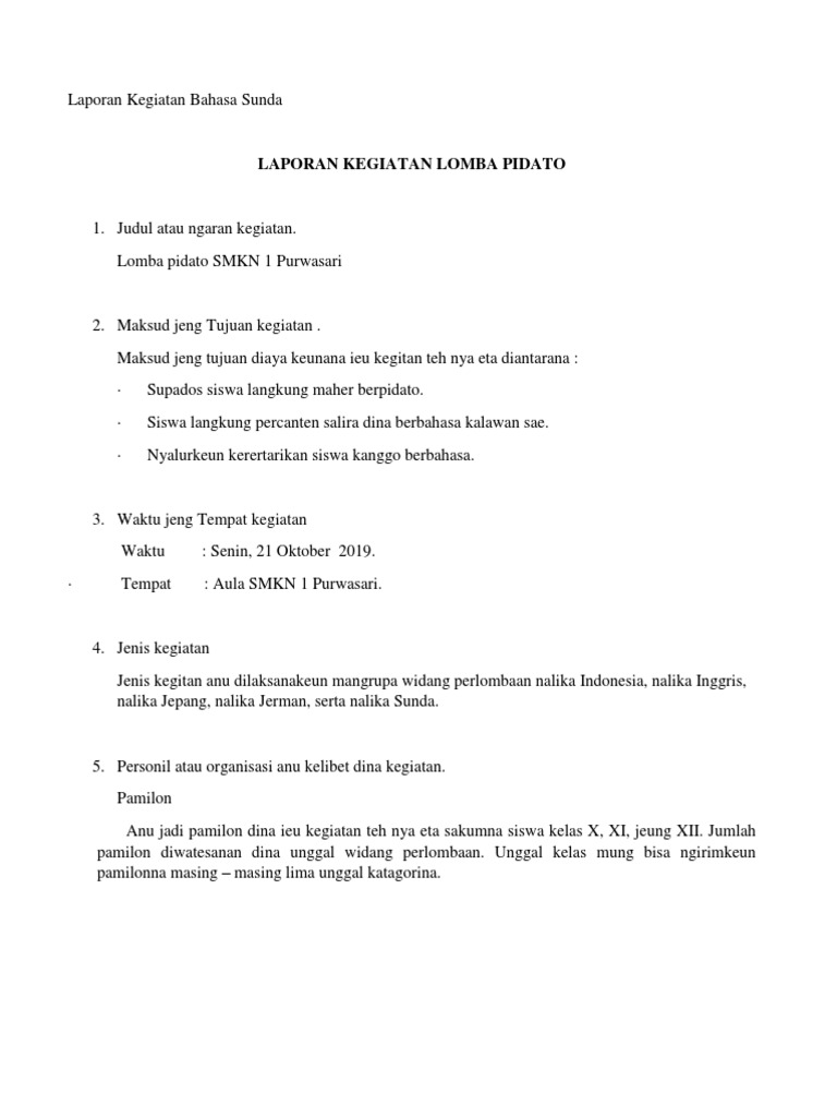 Contoh laporan kegiatan bahasa sunda. Contoh laporan kegiatan bahasa sunda laporan kagiatan peringatan maulid nabi muhammad saw sma negeri 3 cibinong 20112012. Contoh laporan kegiatan bahasa sunda. Klik di sini untuk informasi file lengkap contoh laporan kegiatan lomba dalam bahasa sunda selengkapnya. Dalam kegiatan yang sedang berlangsung biasanya ada kondisi dimana terjadi sesuatu yang tidak ada dalam jadwal atau rencana dengan laporan kegiatan sekolah yang dibuat anda bisa menjadikannyabahan evaluasi setelah kegiatan dan dijadikan pelajaran untuk kegiatan selanjutnya. Contoh berita bahasa sunda tentang bencana alam pamiarsa sadayana nagara indonesia nuju kenging musibah saentosna ntb ayeuna kota palu anu kenging musibah gempa. Contoh laporan singkat kegiatan jika kita bekerja pada sebuah institusi atau berorganisasi di sekolah setiap kegiatan yang diselenggarakan baik itu kegiatan pelatihan bakti sosial pramuka lomba 17 agustus dan acara acara lainnya pasti selalu dimintai pertanggungjawabannya entah itu berupa laporan tertulis ataupun dokumentasi berupa foto.
