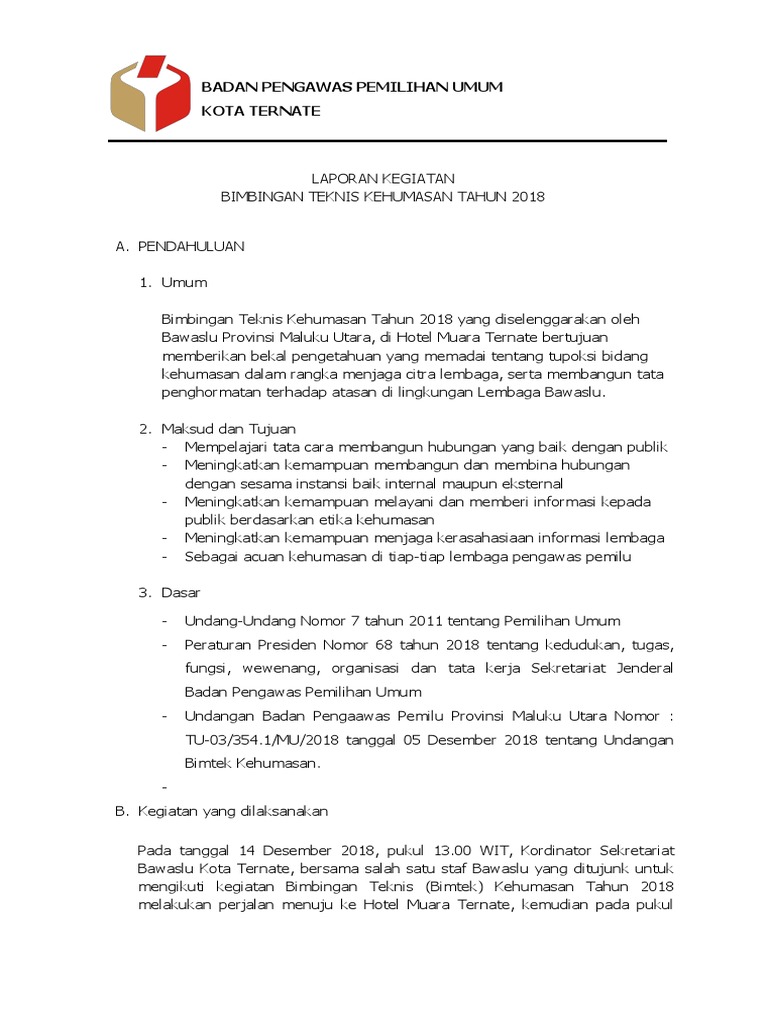 Contoh laporan kegiatan bimtek. 2032 laporan 0 comments. Kegiatan bimtek ini untuk disarankan agar pelaksanaan kegiatan ini dapat dibagi atas bimtek dasar dan bimtek tingkat lanjut. Contoh laporan singkat kegiatan jika kita bekerja pada sebuah institusi atau berorganisasi di sekolah setiap kegiatan yang diselenggarakan baik itu kegiatan pelatihan bakti sosial pramuka lomba 17 agustus dan acara acara lainnya pasti selalu dimintai pertanggungjawabannya entah itu berupa laporan tertulis ataupun dokumentasi berupa foto. Saya panjatkan puji syukur pada allah swt karena telah dapat menyelesaikan program pelatihan bimtek pemanduan bursa kerja khusus bkk dan pembuatan laporan kegiatan pelatihan ini saya selaku duta dari smk taruna nusantara grobogan penawangan kab. Tujuan gerakan pramuka adalah membina kaum muda untuk mencapai potensi sosial spiritual fisik dan intelektual generasi muda. Membuat laporan bisa dibilang mudah juga sulit.