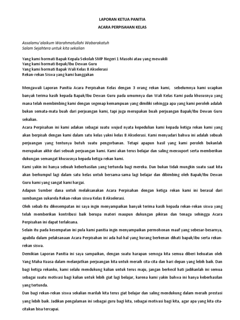 Contoh laporan singkat kegiatan jika kita bekerja pada sebuah institusi atau berorganisasi di sekolah setiap kegiatan yang diselenggarakan baik itu kegiatan pelatihan bakti sosial pramuka lomba 17 agustus dan acara acara lainnya pasti selalu dimintai pertanggungjawabannya entah itu berupa laporan tertulis ataupun dokumentasi berupa foto. Contoh laporan kegiatan jika anda bekerja pada sebuah instansi biasanya melakukan sebuah kegiatan bukanlah hal yang aneh untuk dilakukan. Demikian referensi yang dapat kami berikan tentang teks pidato sambutan ketua panitia singkat 7 contoh pidato terbaik semoga bermanfaat dan bisa menjadi referensi anda sebelum berpidato sebagai ketua panitia. Silahkan sesuaikan dengan kegiatan lembaga anda by abdul0salam 35. 23 24 oktober 2010. Demikian laporan pertanggung jawaban ini kami buat dengan sebaik baiknya dengan harapan laporan kegiatan ini dapat menjadi acuan demi perkembangan kegiatan kegiatan serupa pada periode berikutnya.