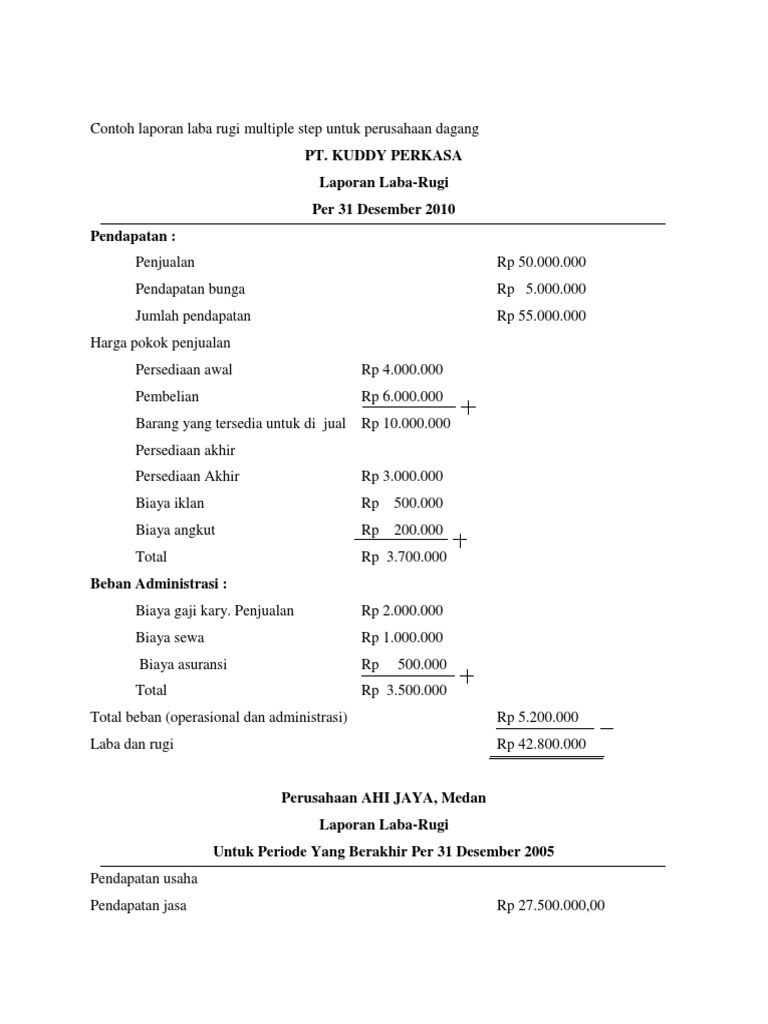 Laporan laba rugi metode tidak langsung mulitple step laporan multiple step disusun dengan cara memisahkan pendapatan usaha dan luar usaha. Pada kenyataannya butuh laporan pembantu untuk mengetahui angkanya seperti laporan penjualan arus kas piutang dll. Selisih antara jumlah pendapatan dan jumlah biaya disebut sebagai laba jika pendapatan biaya. Adapun penyusunan laporan laba rugi perusahaan memiliki tujuan seperti berikut. Terima kasih sy mau coba buat laporan tahunan cv sy yg baru berdiri awal 2017. Klik gambar untuk memperbesar.