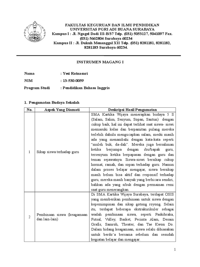 Bagi pembaca laporan dari kegiatan magang menjadi referensi untuk kegiatan pengamatan lain yang relevan. Laporan hasil kegiatan magang 1. Pada kesempatan kali ini penulis ingin menyampaikan penghargaan dan ucapan terimakasih kepada. Laporan magang 1 sma kartika wijaya surabaya disusun oleh. Berdasarkan hasil pengamatan selama 19 hari bahwa kepala sekolah sman 1 mamuju telah menjalankan tugasnya secara maksimal sesuai dengan jabatan sebagai kepala sekolah yaitu bertanggung jawab disiplin waktu berpakaian rapi sert selalu memberikan bimbingan kepada siswa dan pada saat jam masuk sekolah sebelum pukul 0715 kepala sekolah beserta guru piket. Berikut contoh pelaporan untuk magang.