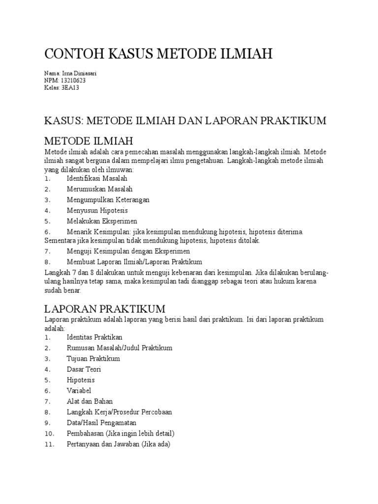 Contoh laporan metode ilmiah. Langkah langkah metode ilmiah yang dilakukan oleh ilmuwan. Jika kesimpulan mendukung hipotesis hipotesis diterima. Menurut situs warta karya ilmiah akan memecahkan suatu permasalahan dari landasan teori dengan metode metode yang bersifat ilmiah sehingga dapat memiliki fakta solusi yang mengenai masalah yang akan diangkat dari penulisan secara berurutan. Arti secara umum apa itu karya tulis ilmiah adalah laporan atau tulisan yang menjabarkan hasil riset atau penelitian suatu masalahpenelitian tersebut dilakukan oleh tim maupun individu yang mana dalam melakukan penelitian harus mengikuti aturan aturan dan kaidah ilmu yang disepakati dan ditaati oleh kalangan keilmuan. Dalam hal ini untuk mendapatkan hasil kajian ilmiah maka harus di lakukan yang namanya penelitian. Karya ilmiah merupakan tulisan yang dapat menjadi tulisan ilmiah dan non ilmiah karena akan dibahas hasil dari penelitian yang telah dilakukan berupa.