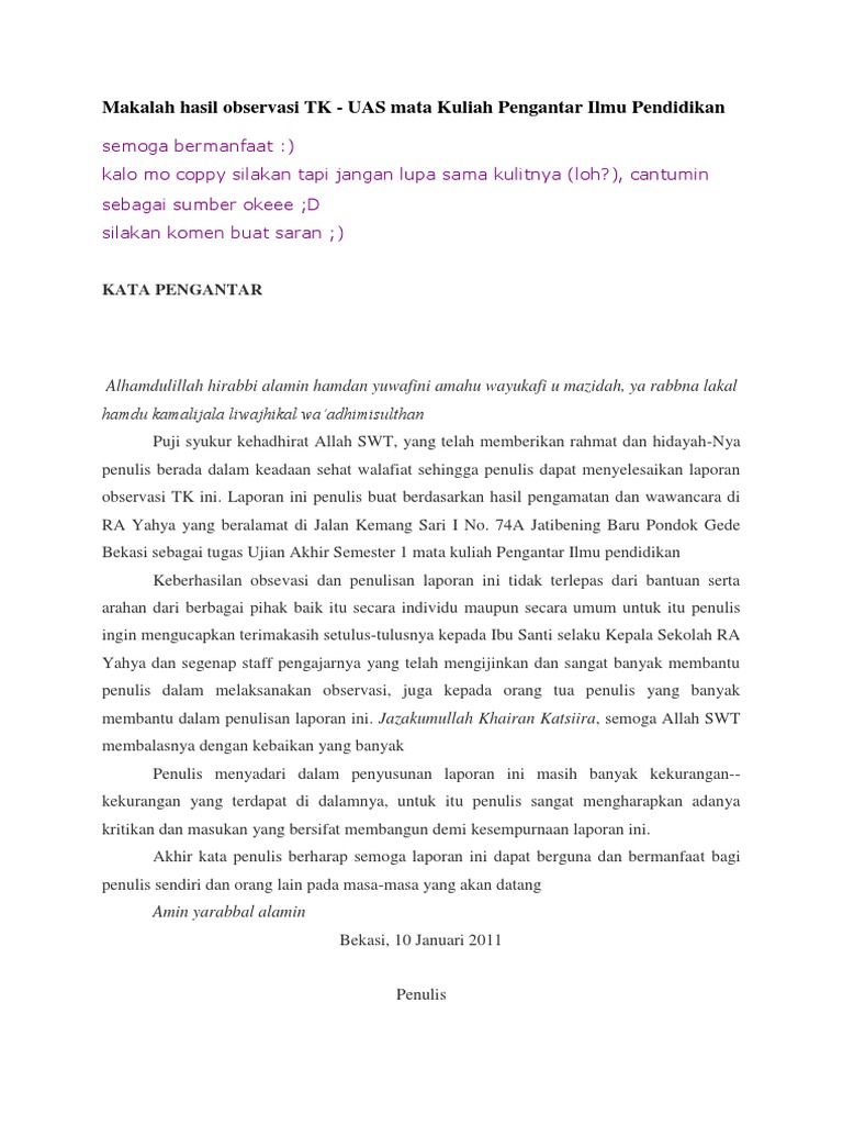 Contoh laporan observasi anak usia dini. Ditinjau dari segi usia anak usia dini adalah anak yang berada dalam rentang usia 0 8 tahun morrison 1988. Anak usia dini merupakan masa usia emas dimana seluruh aspek perkembangannya berkembang pesat pada usia ini. Menurut definisi ini anak usia dini merupakan kelompok yang sedang berada dalam proses pertumbuhan dan perkembangan. Sahabat adin blog yang berbahagia. Kali ini penulis akan memberikan contoh laporan observasi penyimpangan perilaku anak usia didi di sekolah tk yang mana surat ini merupakan salah satu tugas makalah pendidikan ketika menjelang uas ujian akhir semester makalah ini banyak dicari oleh mahasiswa karena memang tugas yang satu ini selalu ada. Pendidikan anak usia dini.