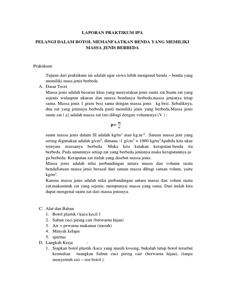 Untuk melihat dan mengetahui bagaimana perbedaan massa jenis setiap zat akan menghasilkan lapisan lapisan struktur berdasarkan perbedaan volume dan kerapatannya massa jenisnya. Pelangi merupakan fenomena alam yang terjadi di langit berupa aneka ragam warna cahaya yang saling sejajar. Langkah pertama dalam membuat teks laporan percobaan ialah terlebih dahulu dengan cara membuat struktur teks laporan percobaan. K4 t1 st3 p1 rpp sd kelas 4 smt 1 sub tema 2e pic. Teks ini membahas tentang hasil apa saja dari percobaan yang dilakukan oleh si pengamat. Buatlah laporan percobaan membuat pelangi 16723565 laporan percobaan adalah salah satu bentuk dari karya tulis ilmiah.