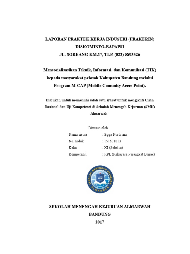 Contoh laporan prakerin buat kalian yang duduk di bangku sekolah menengah kejuruan pasti akan mengalami yang namanya praktik kerja industri prakerin atau biasa juga disebut praktik kerja lapangan pkl. Dapat menyesuaikan diri dengan lingkungan kerja di industri. Laporan prakerin sifatnya adalah wajib jadi siswa harus mengumpulkan laporan prakerin sebagai bukti pertanggung jawaban ilmu apa saja yang sudah didapatkan semasa pkl. Mendapatkan pendidikan atau ilmu pengetahuan yang belum diperoleh di lingkungan sekolah. 13 dasar dan tujuan prakerin. Contoh laporan prakerin jurusan rpl laporan pelaksanaan prakt i k kerja industri.