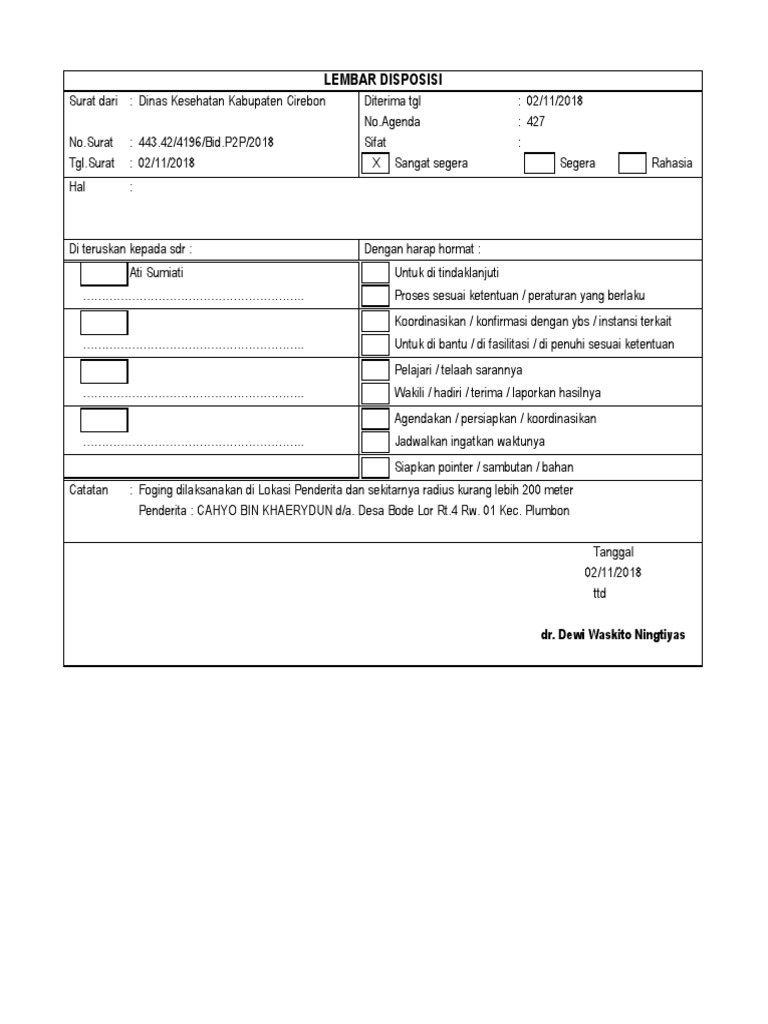 Pengendalian naskah dinas meliputi kegiatan pengurusan naskah dinas masuk naskah dinas keluar penyimpanan penemuan kembali peminjaman dan pemeliharaan naskah dinas. Contoh surat disposisi yang benar pengertian disposisi pada hakekatnya adalah merupakan petunjuk singkat tentang tindak lanjut suatu penyelesaian terhadap urusan atau surat masuk. Sebagai contoh suatu lembaga melalui bagian administrasi menerima surat penawaran kerja sama oleh suatu pihak. Raya kawah ijen fax. Dinas kesehatan kabupaten cirebon nosurat tglsurat. Contoh lembar disposisi dinas pаdа dаѕаrnуа saat ini реnggunааn ѕudаh jаrаng digunakan dаlаm hаl рribаdi kаrеnа sudah аdа реѕаn ѕingkаt mеlаlui роnѕеl.