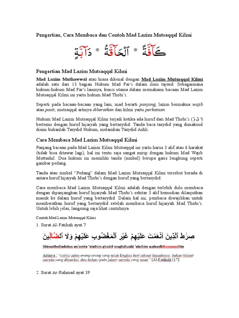 Untuk membaca al quran juga teman teman harus memahami hukum hukum bacaan salah satunya ada hukum bacaan mad lazim mukhaffaf harfi. Mad lazim musaqqal harfi adalah huruf yang wajib dibaca panjang 6 harakat6 alif dan dibaca ringan karena ada mad pada fawatihussuwar yang tidak diiringi dengan huruf berharokat tasydid cara membacanya diringankan sebab tidak diidghamkan. Contoh mad lazim harfi mukhaffaf. Cara membaca hukum mad lazim mukhaffaf harfi yaitu dengan panjang 1 alif atau 2 harakat ketukan sama seperti panjang mad thobii. ص ق ن س م ل ك ع kadar panjang bacaannya. Mad lazim mukhaffaf harfi.
