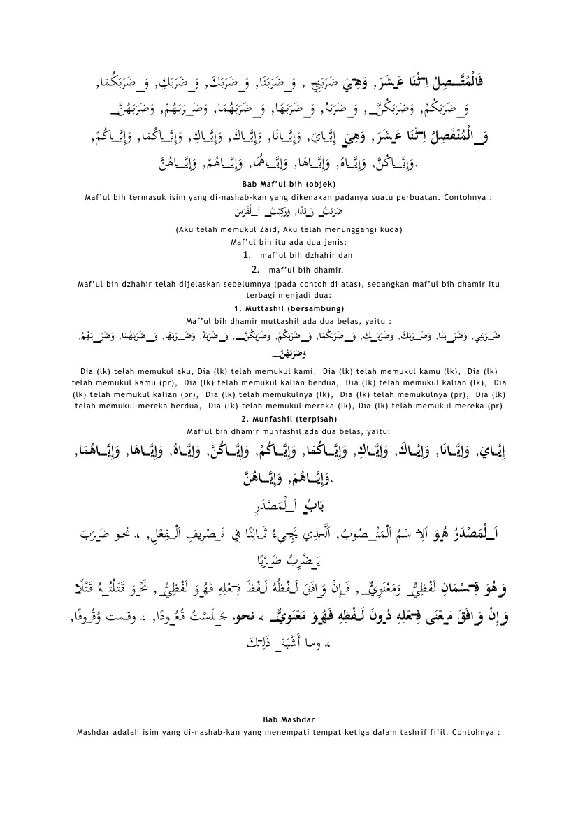Semoga dengan dibuatnya makalah ini menjadi bekal yang bermanfaat bagi pembaca khususnya bagi penulis untuk memperoleh berbagai kemudahan dalam mempelajari al quran dan sunnah. يطلب العاقل العلم orang yang cerdas selalu menuntut ilmu. Kali ini kita akan membahas tentang maful bihdalam bab ini kita membahas tentang definisi maful bih pembagian maful bih ketentuan dalam maful bih dan contoh maful bih dalam al quran. Maful bih berupa isim dlomir berikut saya tuliskan beberapa contoh maful bih dalam al quran. جزاه الله semoga allah membalasnya dhomir ه merupakan isim mabni dengan fathah sebagai maful bih. Maful bih yang dhomir ini terbagi menjadi dua.
