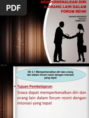 Contoh memperkenalkan diri dalam forum resmi. Dalam kegiatan tersebut anda juga dapat memperkenalkan orang lain misalnya pembicara atau pemateri notulis dan moderator. Kegiatan memperkenalkan diri dilakukan di forum forum resmi misalnya dalam kegiatan seminar atau diskusi. Di dalam menyampaikan kata pembuka dari contoh perkenalan diri sendiri ini yang tidak dalam acara forum resmi hal yang harus kita sampaikan adalah nama alamat hobi tempat tinggalcita cita atau juga bisa anda tambahkan motivator yang menjadi motivasi anda. Memperkenalkan diri dan orang lain dalam forum resmi sebelum memandu acara seorang moderator akan memulai dengan memperkenalkan diri sebagai pihak yang akan memandu acara serta sekilas tentang identitas diri yang diperlukan sesuai dengan situasi dan kondisi. Pada saat memperkenalkan diri atau orang lain dalam forum resmi butir butir yang perlu disampaikan adalah nama lengkap dan panggilan kelahiran pendidikan pekerjaan atau aktivitas prestasi bila ada domisili saat ini dan bidang keahlian. Perhatikan contoh pembicaraan yang diucapkan.