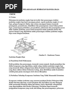 Contoh metode pelaksanaan jembatan rangka baja. Ilm increamental launching method ilm adalah suatu metode erection pada jembatan bentang panjang yang sudah diimplementasikan sejak tahun 1962 yaitu di rio caroni bridge venezuela. Metode ini ditemukan oleh prof. Leonhardt dan partnernya willi baur. Metode cast insitu terdiri dari. Perakitan dan pemasangan struktur jembatan baja baik dengan peluncuran maupun dengan prosedur pelaksanaan pemasangan bertahap harus dilaksanakan oleh penyedia jasa dengan teliti sesuai dengan prosedur yang ditetapkan oleh masing masing buku petunjuk perakitan dan pemasangan dari pabrik pembuat jembatan dan ketentuan umum yang disyaratkan di sini. Metode pelaksanaan jembatan beton dibedakan menjadi 2 yaitu cast insitu dan precast segmental.