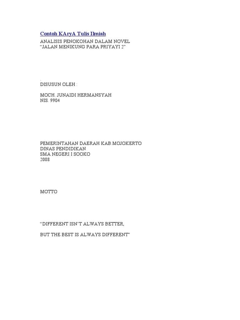 Contoh motto karya tulis. Lebih baik mencoba daripada tidak sama sekali. Karya tulis ini penulis persembahkan untuk memenuhi tugas bahasa indonesia. Membaca adalah sumber kehidupan 3. Contoh karya tulis ilmiah populer sederhana formal non formal tentang pendidikan sampah pergaulan bebas pencemaran air bahaya rokok narkoba kesehatan kenakalan remaja lingkungan yang baik dan benar. Contoh halaman motto dan persembahan dalam karya tulisilmiah motto 1. Contoh motto terbaru dalam skripsi motto hidup dan skripsi pernahkan anda melihat karya ilmiah dengan berbagai motto yang sangat menggugah semangat para pembacanya.