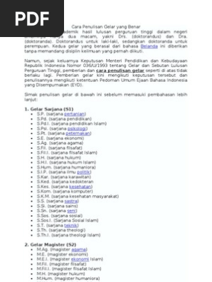 Berikut ini beberapa contoh nama gelar dan singkatannya yang berlaku dan umum digunakan di. Bila seorang menyandang gelar lebih berasal dari satu gelar berikut wajib dipisahkan juga bersama tanda koma satu diantara gelar gelar tersebut. Sebagai misal penulisan gelar sarjana pendidikan yang ditulis benar sarjana pendidikan spd dan ditulis di belakang nama penyandang gelarhuruf s pada kata sarjana ditulis dengan huruf besar dan diakhiri dengan tanda titik merupakan satu kata. Penulisan nama gelar diploma s1 s2 dan s3. Nama penyandang gelar dan gelar dipisahkan menggunakan tanda koma. Contohnya siti zulaikha sag se.