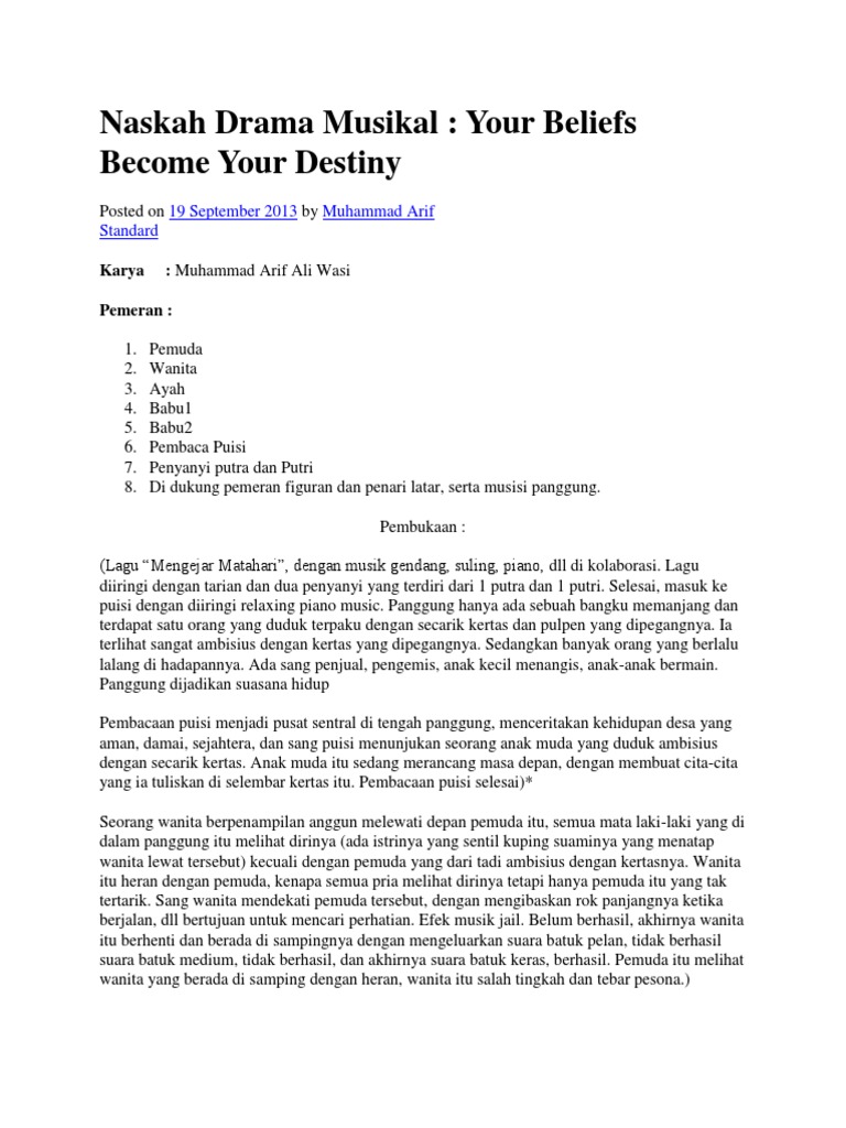 Contoh naskah drama musikal. Tentang belajar tema. Dalam artikel sebelumnya kami sudah membahas mengenai tentang pengertian drama sejarah drama jenis drama unsur unsur drama ciri ciri drama dan tujuannya. Contoh naskah drama singkat. Sudah banyak karya karyanya yang akan selalu memenuhi dinding mading di sekolah dan bahkan ada juga yang di muat ke beberapa koran dan juga majalah. Contoh naskah drama musikal sembilan orang rana merupakan salah satu siswi sebuah sma yang sangat berbakatdibidang seni musik dan sastra. Untuk 4 orang contoh naskah singkat drama anekdot 5 orang tentang persahabatan drama bahasa jawa komedi 5 orang drama musikal meraih mimpi naskah drama 10 orang tentang cita cita naskah drama 4 orang komedi.