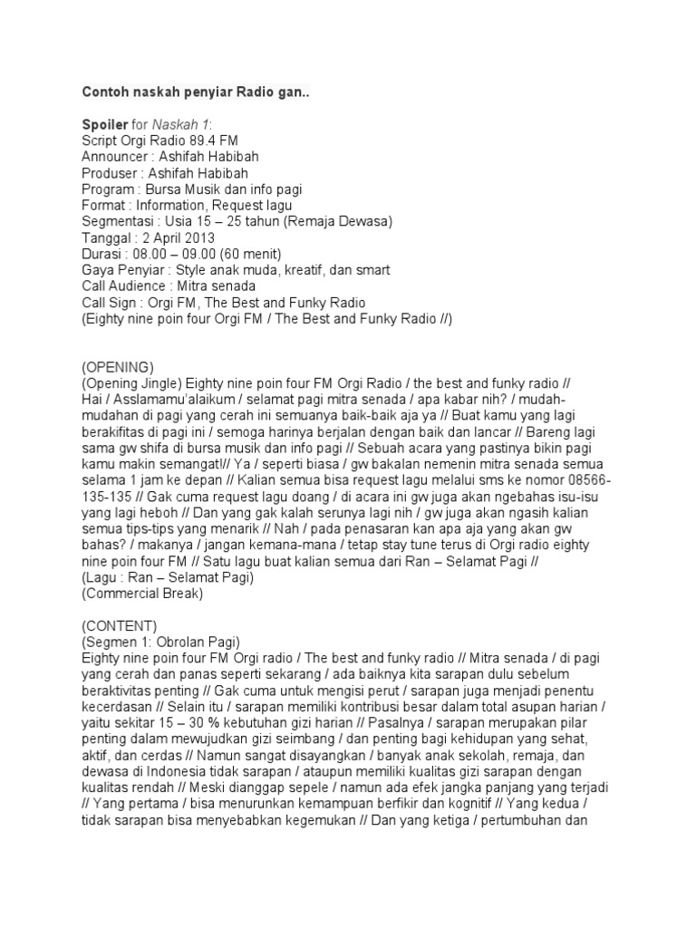 Entah itu penyiar radio kampus radio acara musik atau radio berita yang penuh dengan informasi terkini. 30 menit naskah. Kalau pernah ane mau sharing tentang naskah yang biasanya dibacakan oleh penyiar radio. Contoh naskah siaran radio mengasah skill itu bagus lhoo apalagi skill kita dalam berkomunikasi dengan orang banyak seperti profesi sebagai penyiar radio yang supel dan harus pandai bergaul masuk ke semua kalangan. Naskah berita radio lebih ringkas menggunakan bahasa tutur informal dan menggunakan tanda tanda baca khusus sign posting. Pertanian bioindustri berbasis tanaman dan ternak ramah lingkungan bentuk.