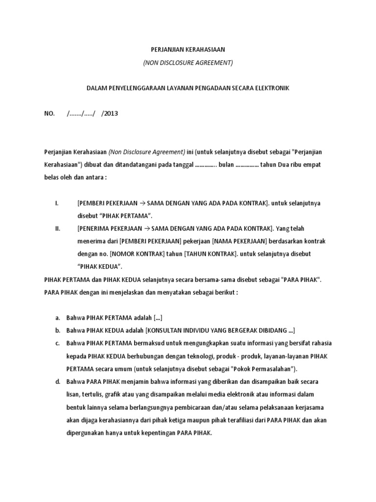 Prima inti karsa abadi pika a company incorporated under the laws of indonesia and having its registered office at. Protect your privacy with our free non disclosure agreement template. Kami pernah menangani sistem informasi untuk rumah sakit dimana pihak rumah sakit sangat selektif memberikan data untuk menunjang pekerjaan kami. This confidentiality agreement this agreement dated as of 2011 is made by and between ltd a company incorporated under the laws of a nd having its office located at company and recipient and pt. A non disclosure agreement nda or confidentiality agreement is a legally binding contract which protects trade secrets or other sensitive information from being revealed. Contoh perjanjian kerahasiaan non disclosure agreement kesepakatan untuk melakukan kerjasama yang dituangkan dalam sebuah perjanjian kerjasama terkadang membutuhkan perjanjian pelengkapturunan guna mengatur secara khusus klausula tertentu.
