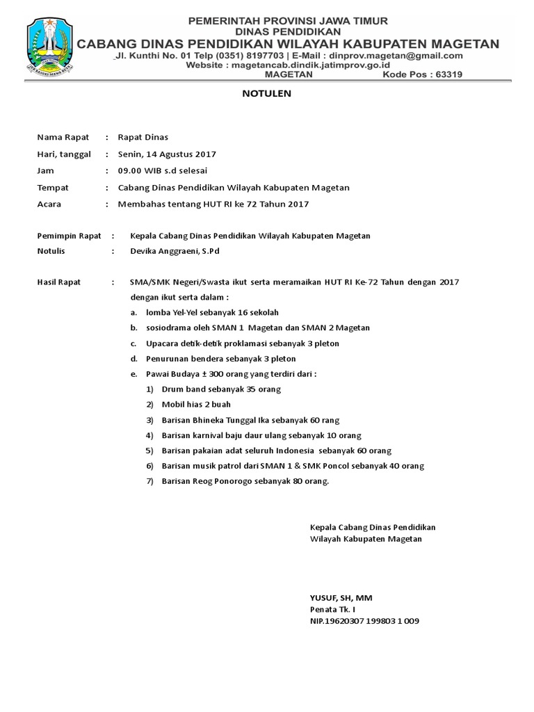 Contoh notulen rapat dinas. Seperti kantor rapat desa karang taruna rapat bem rapat osis rapat perusahaan rapat kerja rapat dinas dan lain sebagainya. Berikut ini beberapa contoh notulen rapat kantor pemerintahan perusahaan sekolah dinas organisasi perusahaan swasta dan osis. Banyak contoh notulen yang dapat kita pelajari mengingat hampir semua organisasi melakukan rapat. 7 contoh notulen rapat terlengkap untuk berbagai rapat dinas sekolah dan organisasi 26 januari 2020 nah jika anda saat ini berencana mengadakan sebuah rapat ataupun diskusi tertentu maka pastinya anda sedang mencari contoh notulen rapat sebelum rapat tersebut anda selenggarakan. Salah satu administrasi yang baik adalah dengan dicatatnya semua kegiatan organisasi seperti seminar diskusi ataupun rapat. Contoh notulen rapat sebuah organisasi yang baik tentu harus memiliki administrasi yang baik pula.