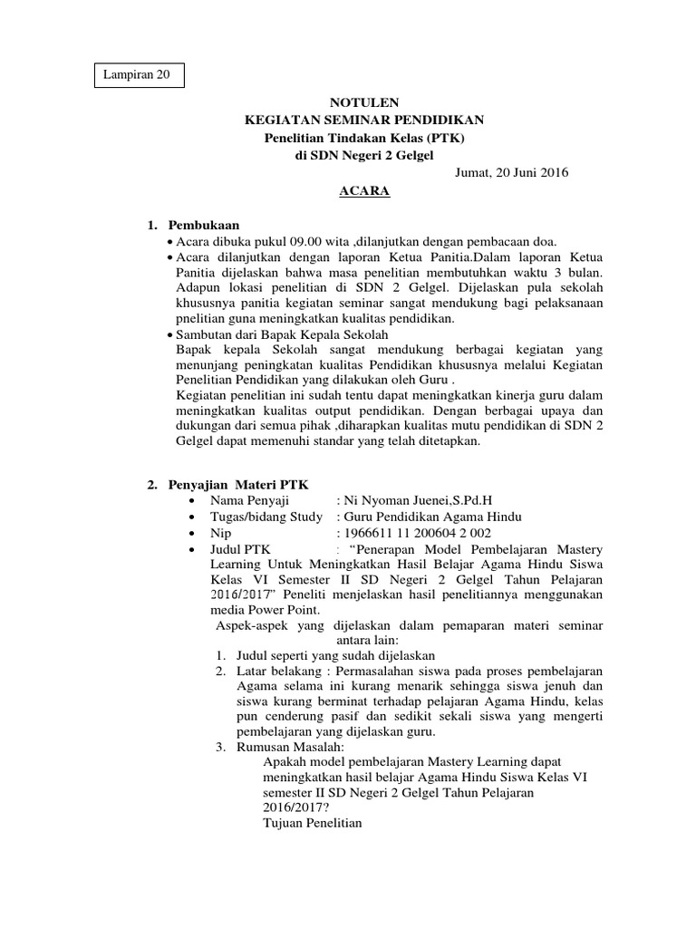 Monday december 30 2019. Blog ini berisi konten tentang juknis ptk untuk angka kredit contoh laporan ptk yang sudah dinilai contoh lampiran seminar ptk contoh lengkap lampiran ptk. Notulen seminar nasional kelas berkualitas untuk semua. Posting lebih baru posting lama beranda. Adapun notulen jalannya acara seminar print out bahan tayang paparan penyaji serta foto kegiatan seminar sebagaimana terlampir dalam berita acara ini. Contoh notulen seminar ptk sd.