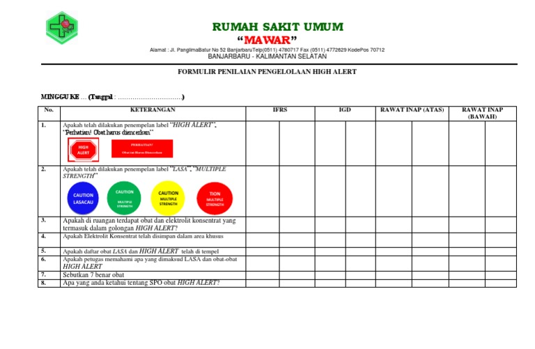 Contoh obat lasa dan high alert pdf. Jika obat lasa nama sama hanya ada 2 kekuatan yang berbeda maka. High alert medication atau obat dengan kewaspadaan tinggi adalah obat obat yang secara signifikan berisiko membahayakan pasien bila digunakan dengan salah atau pengelolaan yang kurang tepat. Farmasis menyiapkan obat sesuai. Obat lasa dengan kekuatan besar diberi stiker biru obat lasa dengan kekuatan kecil diberi stiker hijau 6. Obat lasa elektrolit konsentrasi tinggi dan high alert penyusun. Kloral hidrat e adalah hipnosis dan obat penenang yang memperlambat aktivitas sistem saraf pusatkloral hidrat e rektal digunakan untuk mengobati masalah tidur insomnia.