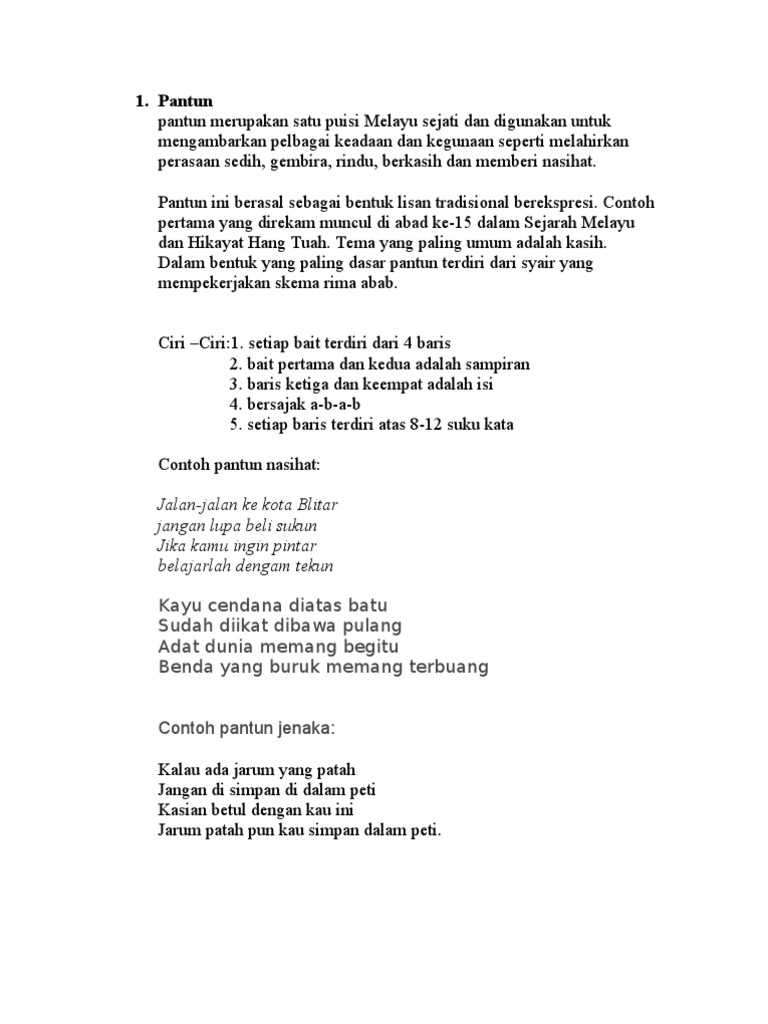 Pada awalnya pantun di gunakan sebagai media menyampaikan pesan pesan nasihat kepada orang lain. Contoh pantun bersajak a b a b orang buta jalan dituntun 1 yang menuntun si kabayan 2 mari kita bermain pantun 3 melepas lelah seharian 4 perhatikan rima atau persamaan bunyi di baris akhir. Selain menyampaikan pesan utama yang ingin disampaikan pantun juga memiliki unsur hiburan bahkan pantun juga terkadang dibuat untuk sindiran loh. Inilah beberapa contoh di antaranya. Buah nangka buah sukun tertusuk duri tangan berdarah. Pantun yang baik adalah pantun yang sampiran dan isinya sama sama memiliki makna meskipun keduanya tidak ada hubungan.