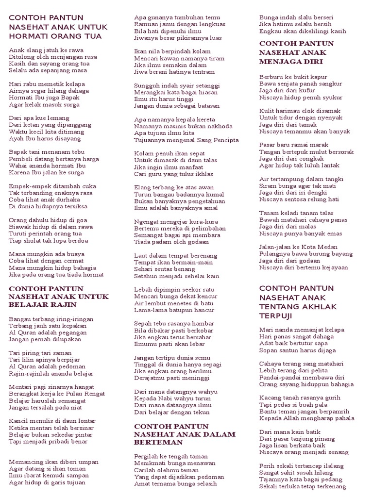 Contoh pantun kanak kanak muda dan tua pantun adalah bentuk puisi indonesia melayu yang merupakan ungkapan perasaan dan pikiran yang dapat menghibur sekaligus menegur. Karena ungkapan perasaan dan pikiran tersebut disusun dengan kata kata yg sedemikian rupa sehingga menarik untk didengar atau dibaca. 105 contoh pantun nasehat belajar pendidikan orang tua agama anak adab maknanya untuk pembahasan kali ini kami akan mengulas mengenai pantun nasehat yang dimana dalam hal ini meliputi belajar pendidikan orang tua agama anak adab dan maknanya untuk lebih memahami dan mengerti simak ulasan dibawah ini. Namun sebelum mengenal apa saja jenis jenis pantun sebaiknya pahami dulu ciri ciri pantun di bawah ini. Adat agama budi nasehat pahlawan kias dan peribahasa. Kata pantun berasal dari sebuah kata patuntun yang ada dalam bahasa minangkabau yang artinya petuntun.