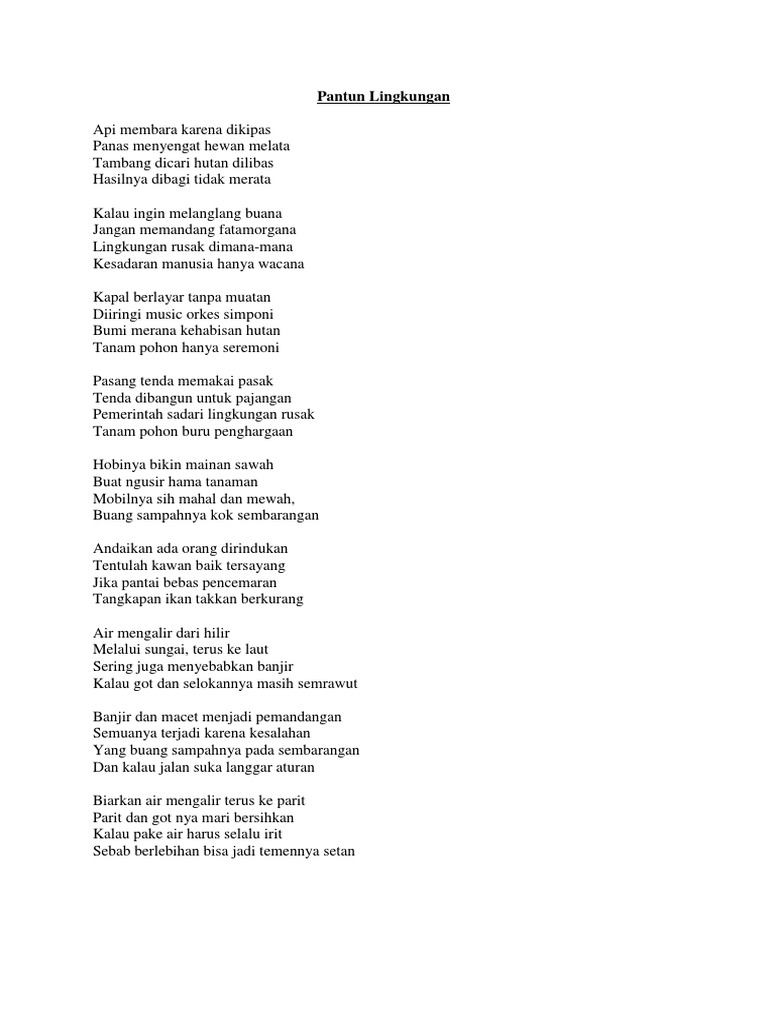 Berikut adalah pantun pantun tentang pentingnya menjaga dan melestarikan lingkungan. Namun kita sering melihat berbagai tindakan perusakan yang berakibat kepada pencemaran lingkungan. Mudah mudahan bisa menjadi pengingat bagi kita semua. Karena lingkungan hidup yang indah. Sobat bisa lantunkan pantun cinta ini di depan pasangan tercinta. Menurut situs ensiklopedia online terbesar wikipedia pantun merupakan salah satu jenis puisi lama yang sangat dikenal oleh masyarakat luas baik dalam bentuk lisan maupun tulisan setiap barisnya terdiri dari 8 12 suku kata dan berima abab atau aaaa.