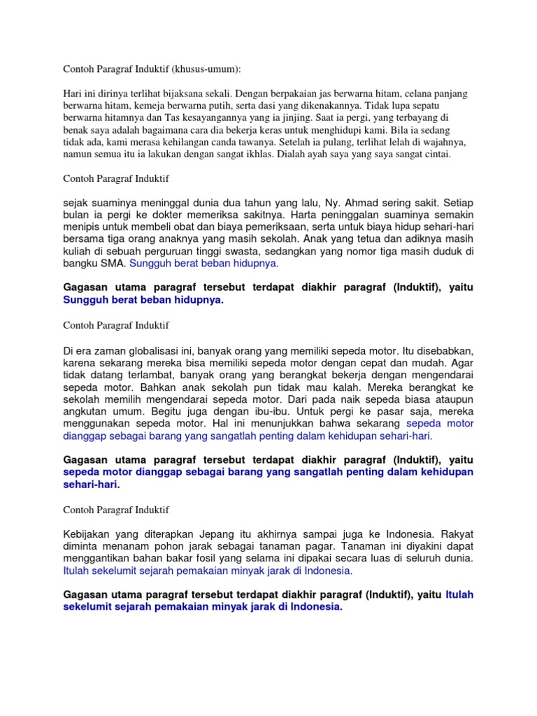 Contoh paragraf khusus umum. Paragraf ini umumnya diawali dengan pernyataan yang bersifat umum kemudian dilengkapi dengan penjelasan yang khusus yang berupa contoh rincian khusus bukti bukti dan lain sebagainya. Paragraf deduktif adalah sebuah paragraf yang kalimat utamanya berada pada awal atau baris pertama paragraf. Paragraf induktif adalah sebuah paragraf yang menjabarkan hal hal khusus terlebih dahulu pada awal paragraf lalu disimpulkan menjadi suatu hal yang umum yang mencakup semua hal khusus tadi. Selain itu pernyataan umum juga dapat ditemukan dalam contoh teks penjelasan. Paragraf deduktif dan induktif bisa kita campur apabila ada suatu paragraf yang mengharuskan adanya kalimat utama di awal paragraf dan akhir paragraf. Penjelasan umum berisi atau menyajikan informasi pembukaan atau deskripsi pendahuluan dari konten yang dibahas di bagian selanjutnya.