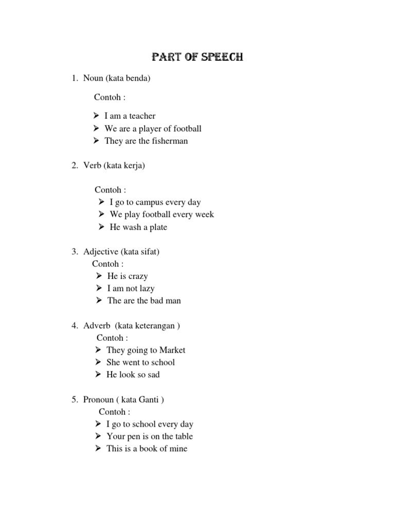 Noun kata benda noun ini digunakan untuk menamai orang benda hewan tempat dan konsep abstrak. Macam macam parts of speech penggunaan dan contoh kalimat delapan part of speech 1. They study english everyday. Anak anak yang lapar memakan burger he saw some beautiful pictures. Verb kata kerja ini adalah kata yang menyatakan suatu aktifitas atau kondisi.