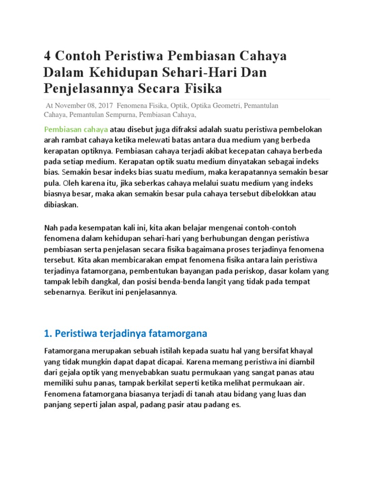 Contoh pembiasan cahaya dalam kehidupan sehari hari. Artikel ini membahas tentang 4 peristiwa pembiasan cahaya dalam kehiudupan sehari hari yaitu fenomene fatamorgana pembentukan bayangan pada periskop dasar kolam tampak dangkal dan bintang terlihat lebih jauh di angkasa. Pensil yang dimasukkan ke dalam air di gelas dari sisi gelas nampak bengkok. Dalam hal ini peristiwa pembiasan cahaya terjadi dalam kehidupan sehari hari antara lain. Contoh pembiasan cahaya yang dapat kamu ketahui dalam kehidupan sehari hari. Ikan di dalam kolam terlihat dekat dengan permukaan padahal tidak. Sedotan yang tercelup air sebagian tampak membengkok.