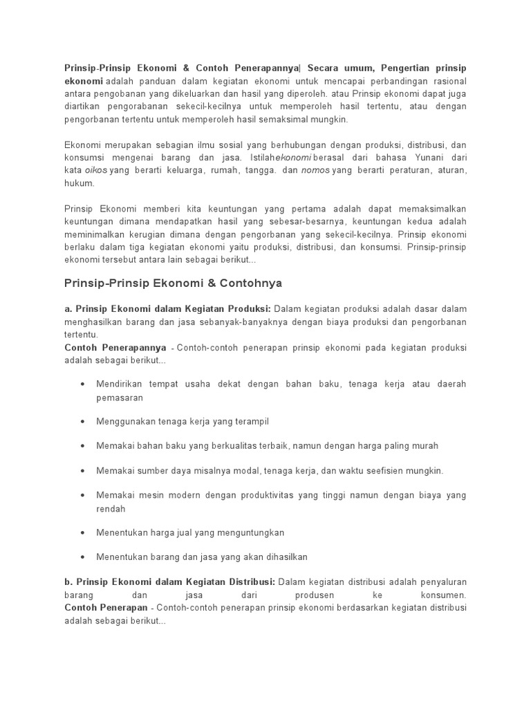 Prinsip ekonomi adalah prinsip dasar yang bisa diterapkan dalam tiga kegiatan ekonomi yaitu kegiatan produksi konsumsi dan distribusi. Selanjutnya mencari barang yang harganya diskon atau ada potongan harga dan belajar hidup hemat. Contoh penerapan. Berikut ini kami sajikan beberapa contoh prinsip ekonomi dalam kehidupan kita. Prinsip ekonomi adalah upaya yang bisa dilakukan untuk mendapatkan hasil maksimal dengan pengorbanan minimum. Dalam kegiatan sehari hari kita secara sadar atau tidak kita juga menerapkan prinsip ekonomi.