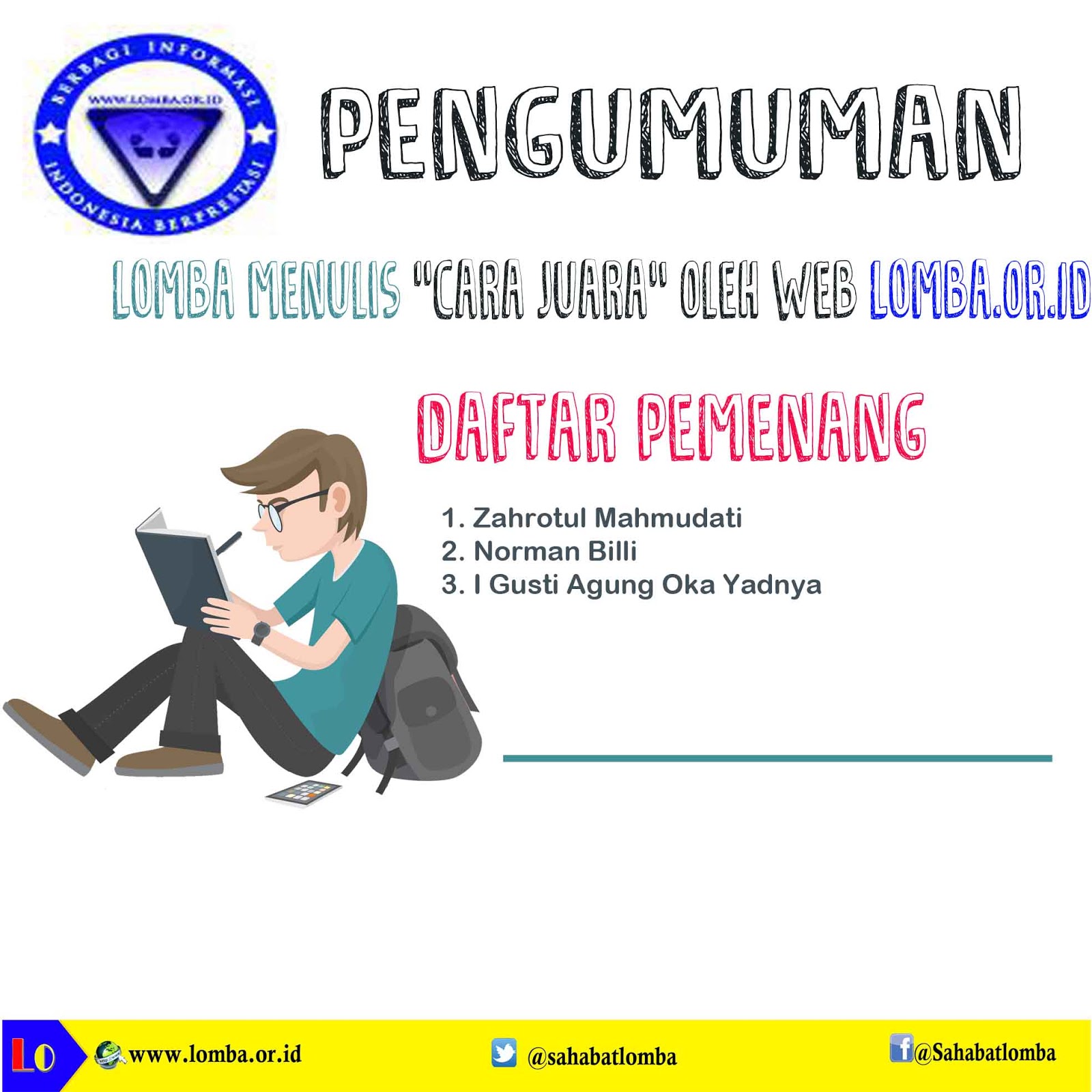 Demikianlah beberapa contoh pengumuman lomba dalam. Berisi tentang kesimpulan harapan mohon maaf kalau ada kekurangan dan bisa lebih baik dalam event selanjutnya contoh teks sambutan pengumuman pemenang lomba nah berikut ini contoh sambutannya. Ketua karang taruna rt 05. Demikianlah contoh pengumuman pemenang lomba dalam bahasa indonesia. Untuk itu kami tim jejak publisher mengucapkan terima kasih banyak kepada para peserta. Semoga bermanfaat dan mampu menambah wawasan para pembaca sekalian baik itu mengenai pengumuman khususnya maupun bahasa indonesia pada umumnya.