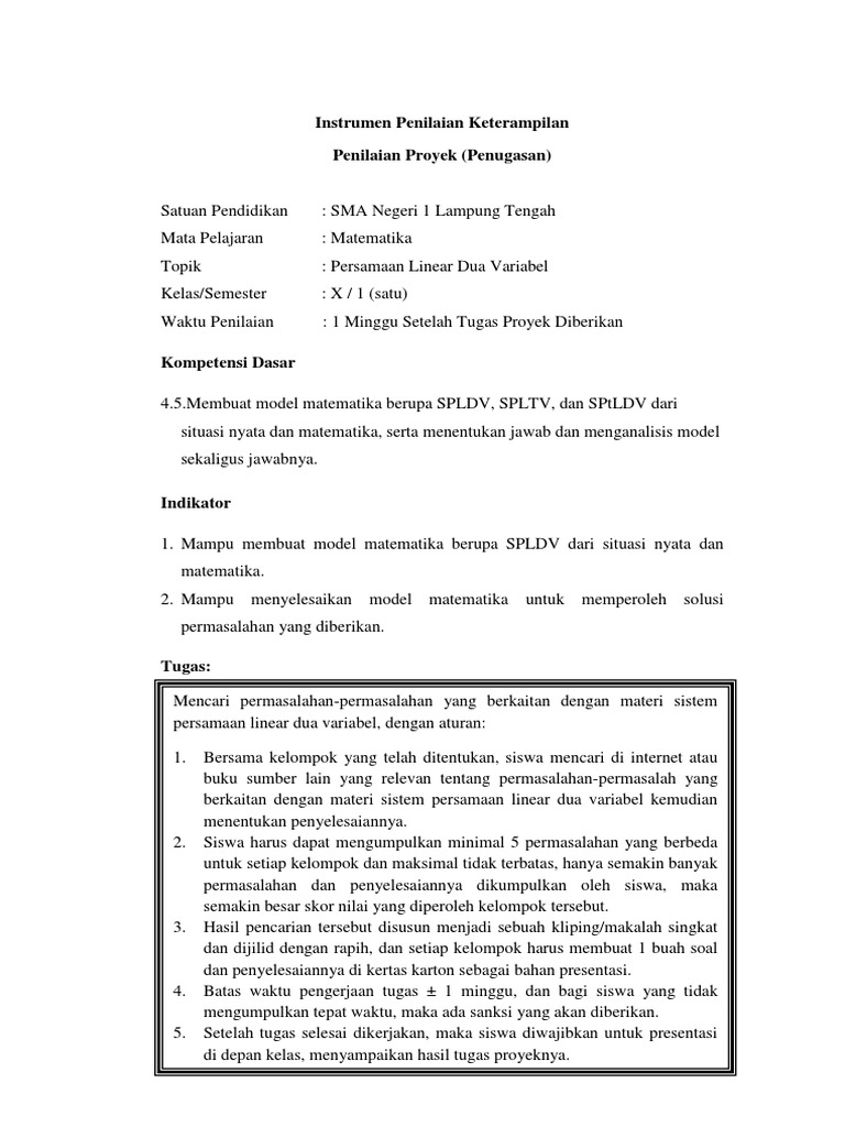 Mulai dari silabus prota dan promes rpp maupun perangkat yang lain. Contoh format penilaian proyek siswa sd smp sma kurikulum 2013 ini akan menjadi bahasan saya pada postingan kali ini setelah sebelumnya saya posting tentang format penilaian portofolio yang anda bisa baca disinipenilaian proyek ini merupakan salah satu teknik yang digunakan pada penilaian keterampilan psikomotor selain portofolio produk unjuk kerja dll. Pada kolom skor yang sesuai dengan penilaian guru. Penilaian proyek merupakan kegiatan penilaian terhadap proses dan hasil dari suatu tugas yang harus diselesaikan dalam periode atau waktu tertentu. Postingan ini membahas tentang pengertian fungsi contoh instrumen penilaian produk berbasis proyek cara mengisi instrumennya. Hasil penilaian dengan teknik praktik dan proyek dirata rata untuk memperoleh nilai akhir keterampilan pada setiap mata pelajaran.