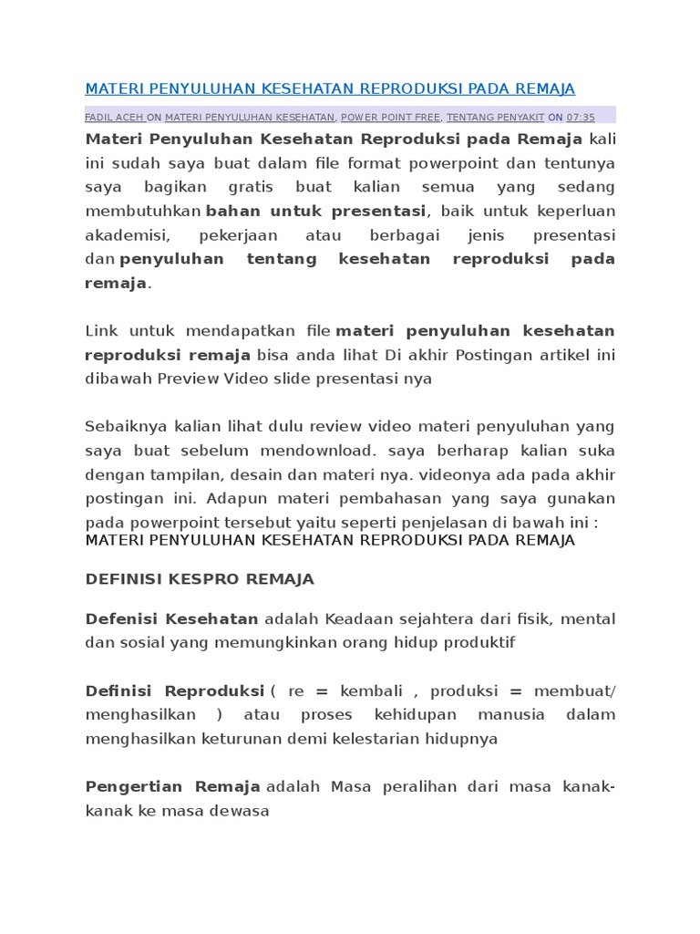 Pengertian kesehatan reproduksi adalah suatu keadaan kesehatan yang sempurna baik secara fisik mental dan sosial dan bukan semata mata terbebas dari penyakit atau kecacatan dalam segala aspek yang berhubungan dengan sistem reproduksi fungsi serta prosesnya. Kegiatan kegiatan seksual menempatkan remaja pada tantangan risiko terhadap berbagai masalah kesehatan reproduksi. Kode mata kuliah. Dani ramdhani dinas kesehatan kab. Materi penyuluhan kespro remaja 1. Masa remaja diwarnai oleh pertumbuhan perubahan munculnya berbagai kesempatan dan seringkali menghadapi risiko risiko kesehatan reproduksi.